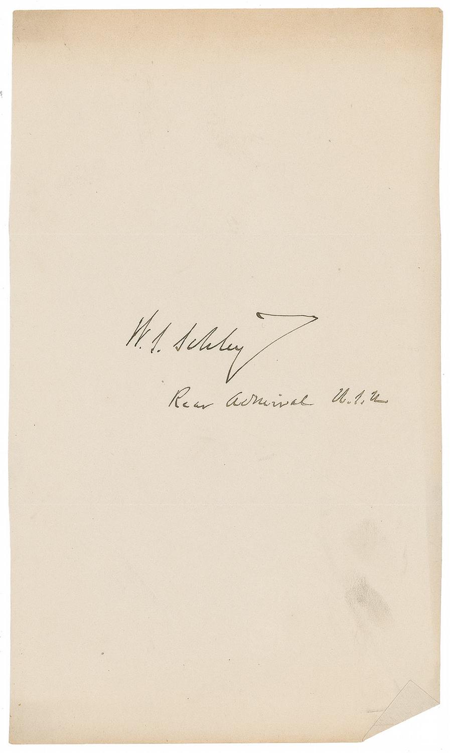 Naval officer (1839-1911) who commanded the destruction of the Spanish fleet at Santiago de Cuba and who led the expedition to rescue Adolphus Greeley in the Arctic. Ink signature, “W. S. Schley, Rear Admiral, U.S.N.,” on an off-white 4.75 x 8 sheet. In fine condition, with some scattered light edge toning and creasing, all of which could be easily matted out.