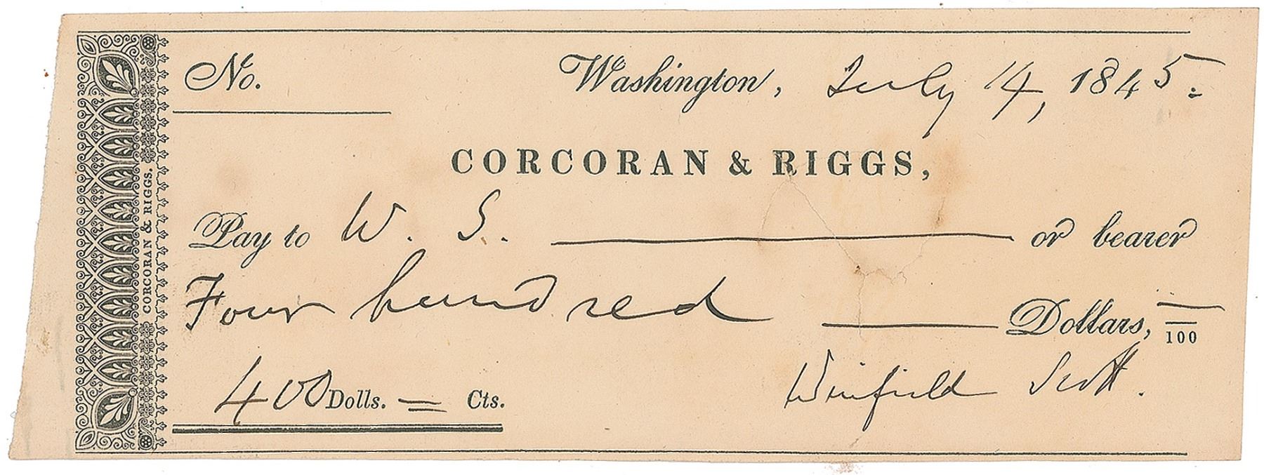 Corcoran & Riggs bank check, 6.25 x 2.25, filled out in another hand and signed by Scott, "Winfield Scott," payable to W. S. for $400, July 14, 1845. In fine condition.