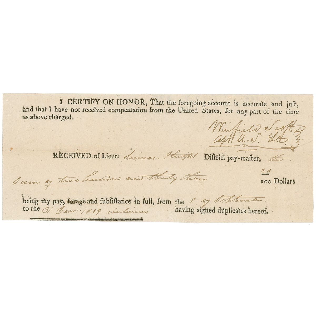 Mexican War and Union commander (1786–1866) nicknamed ‘Old Fuss and Feathers’ for his love of military pageantry. Partly-printed, self-contained DS, one page, 7 x 2.5, no date. “I certify on honor, that the foregoing account is accurate and just, and that I have not received compensation from the United States, for any part of the time as above charged,” signed “Winfield Scott, Capt. U. S. A.,” and continues on to list the sum owed as $233.00. Central horizontal crease, light toning, and trimmed edges, otherwise fine condition.
