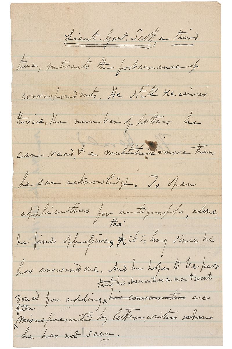 Union general (1786–1866). A year older than the Constitution, the venerable Scott, hero of the War of 1812 and the Mexican War, became General in chief of the U S Army in 1841, a position he still held at the start of the Civil War. A Virginian, he was the only non-West Pointer of Southern origin in the Regular Army to remain loyal to the Union. Third person ALS signed “Lieut. Genl. Scott” at the top, one page, lightly-lined, 4.5 x 7.5, no date, sent to The Herald. Letter written in the third person expressing displeasure with unwanted correspondence and autograph requests. In full: “Lieut. Genl. Scott, a third time, entreats the forbearance of correspondents. He still receives thrice the number of letters he can read, & a multitude more than he can acknowledge. To open applications for autographs, alone, he finds oppressive, tho’ it is long since he has answered one. And he hopes to be pardoned for adding that his observations on men & events are often misrepresented by letter-writers he has not seen.” Intersecting folds, with light separation to a horizontal fold and a vertical fold passing through beginning of signature, a few creases, and light uniform toning, otherwise fine condition.