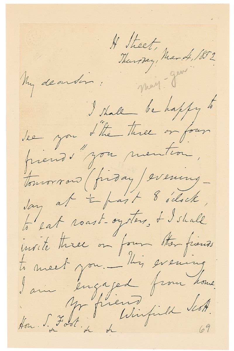 Union general (1786–1866). A year older than the Constitution, the venerable Scott, hero of the War of 1812 and the Mexican War, became General-in-chief of the US Army in 1841, a position he still held at the start of the Civil War. A Virginian, he was the only non-West Pointer of Southern origin in the Regular Army to remain loyal to the Union. ALS, one page, 4.5 x 7, March 4, 1852. Letter accepting a meeting. In part: “I shall be happy to see you & ‘the three or for friends’ you mention tomorrow…to eat roast oysters, & I shall invite three or four other friends to meet you.” Letter is inlaid to a slightly larger sheet. In fine condition, with a couple small pencil marks and a couple tiny pinholes.
