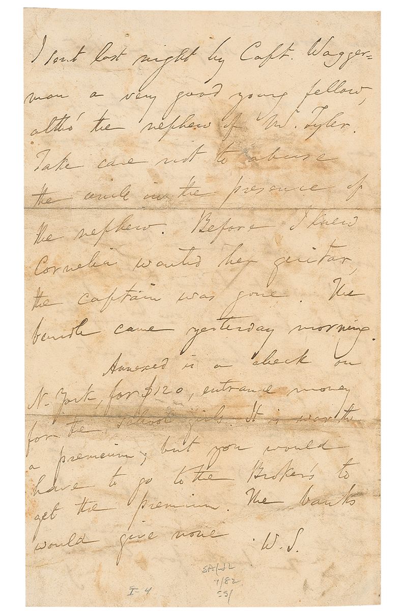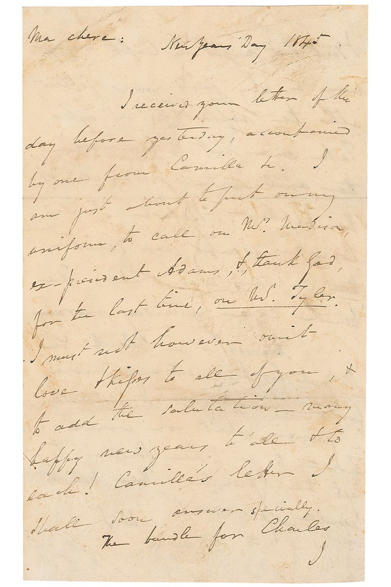 Union general (1786–1866). A year older than the Constitution, the venerable Scott, hero of the War of 1812 and the Mexican War, became general-in-chief of the US Army in 1841, a position he still held at the start of the Civil War. A Virginian, he was the only non-West Pointer of Southern origin in the Regular Army to remain loyal to the Union. ALS signed “W. S.,” one page both sides, 4.5 x 8, January 1, 1845. Letter to his wife. In full: “I received your letter of the day before yesterday, accompanied by one from Camilla etc. I am just about to put on my uniform, to call on Mrs. Madison, ex-president Adams, &, thank God, for the last time, on Pres. Tyler. I must not however omit love & kisses to all of you, & to add the salutation—many happy new years to all & to each! Camilla's letter I shall soon answer specially. The bundle for Charles I sent last night by Capt. Waggerman a very good young fellow, altho' the nephew of Mr. Tyler. Take care not to abuse the uncle in the presence of the nephew. Before I knew Cornelia wanted her guitar, the captain was gone. The bundle came yesterday morning. Annexed is a check on N. York for $120, entrance money for the school girls. It is worth the premium; but you would have to go to the Broker‘s to get the premium. The banks would give none.” In good condition, with heavy scattered toning and soiling, separations to mailing folds repaired with tape on the reverse, and a few pencil notations at the bottom. Although it was Tyler who appointed him commanding general of the United States Army, it is not surprising that the two were incompatible—both were native Virginians, but Tyler would go on to become a representative in the Confederate Congress while Scott stood by the Union. We can look to Scott’s unbridled disdain for Tyler by the end of his presidency as a sign of the growing division in the country in the years prior to the Civil War.