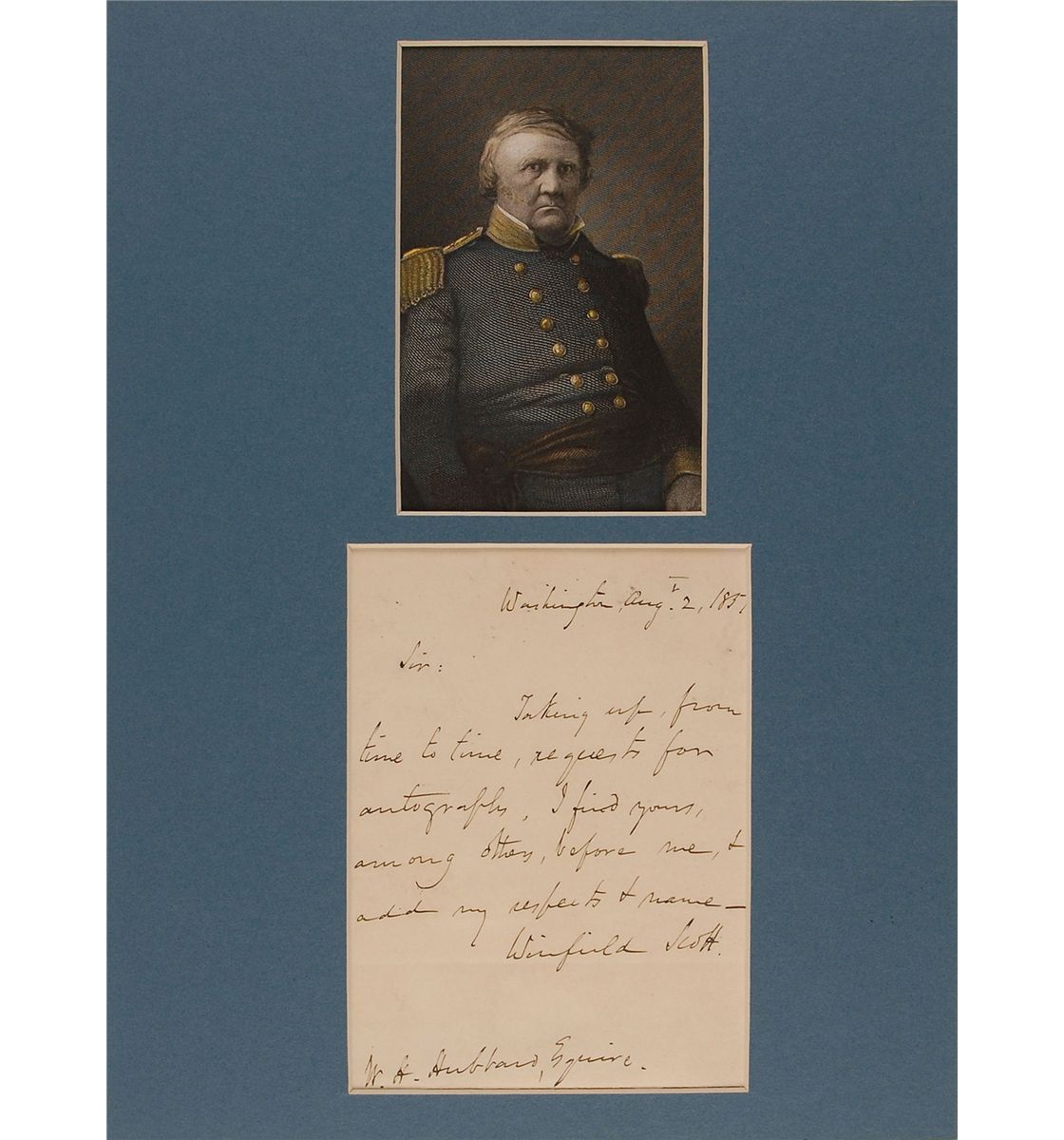 ALS, one page, 3.75 x 5.25, Washington, August 2, 1851. Letter to W. H. Hubbard. In full: “Taking up, from time to time, requests for autographs. I find yours, among others, before me, & add my respects & name.” Matted with a photo of Scott in uniform to an overall size of 8 x 11. In fine condition, with some mild soiling. Accompanied by an ALS from Scott’s wife, signed “M. Mayo Scott,” transmitting a check to a gentleman, also matted to an overall size of 8 x 11.