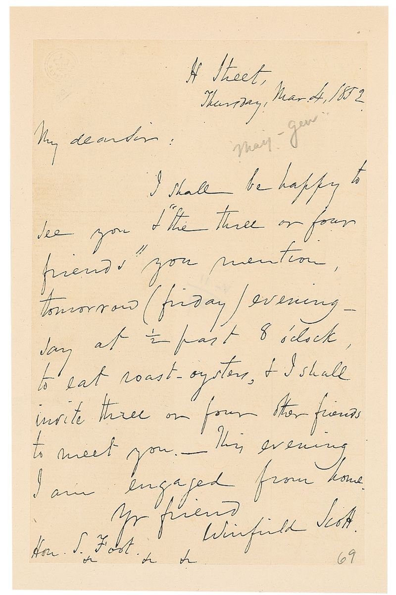 Union general (1786–1866). A year older than the Constitution, the venerable Scott, hero of the War of 1812 and the Mexican War, became General-in-chief of the US Army in 1841, a position he still held at the start of the Civil War. A Virginian, he was the only non-West Pointer of Southern origin in the Regular Army to remain loyal to the Union. ALS, one page, 4.5 x 7, March 4, 1852. Letter accepting a meeting. In part: “I shall be happy to see you & ‘the three or for friends’ you mention tomorrow…to eat roast oysters, & I shall invite three or four other friends to meet you.” Letter is inlaid to a slightly larger sheet. In fine condition, with a couple small pencil marks and a couple tiny pinholes.