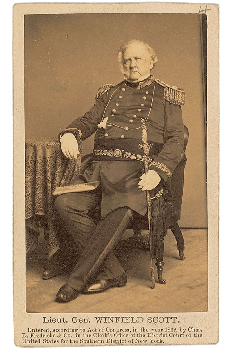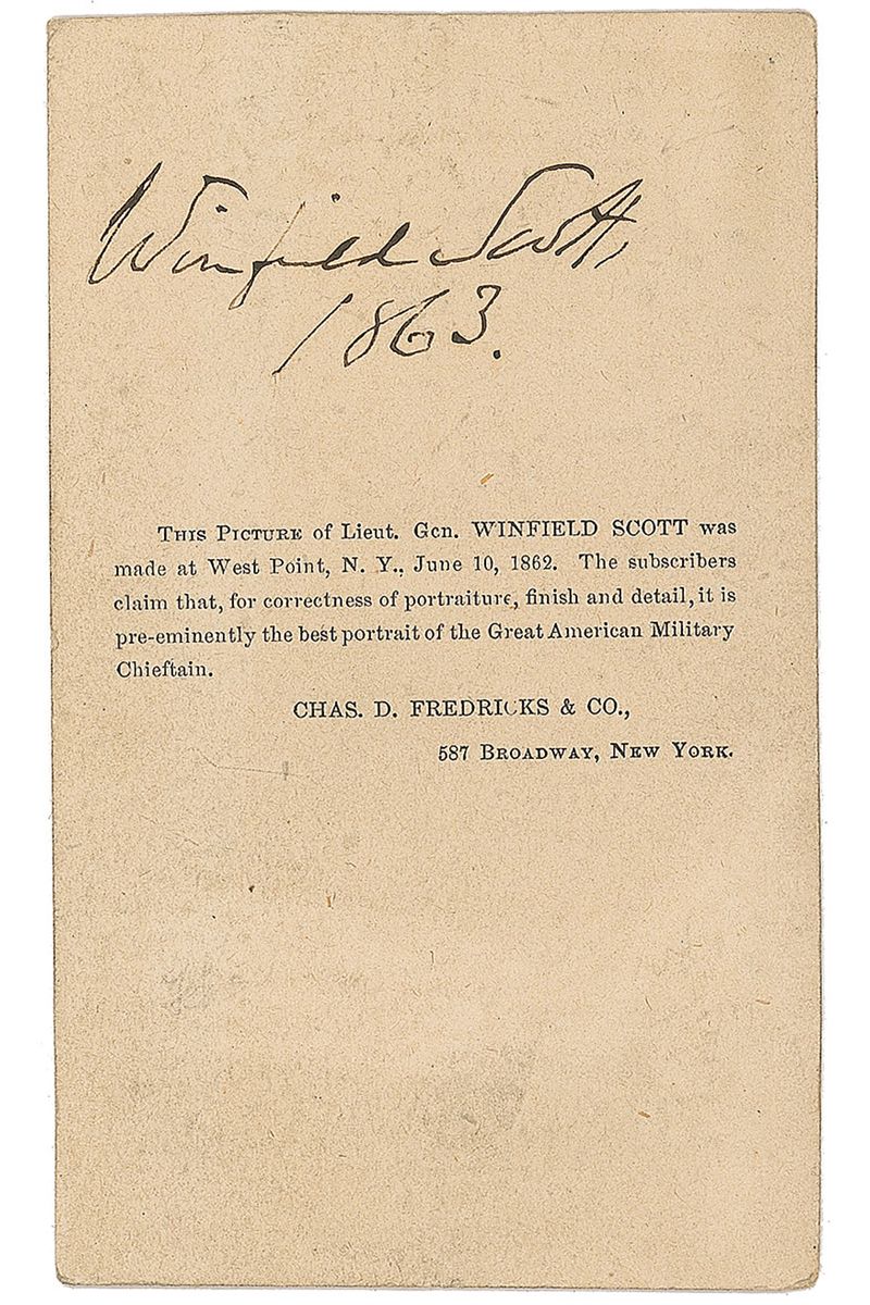 Original 2.5 x 4 carte-de-visite seated portrait of Scott in uniform and holding a sabre, signed on the reverse in black ink, “Winfield Scott, 1863.” Published by C. D. Fredericks of New York. In fine condition, with light overall wear to reverse.