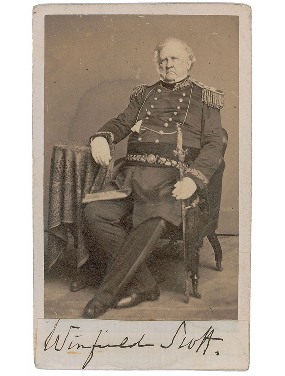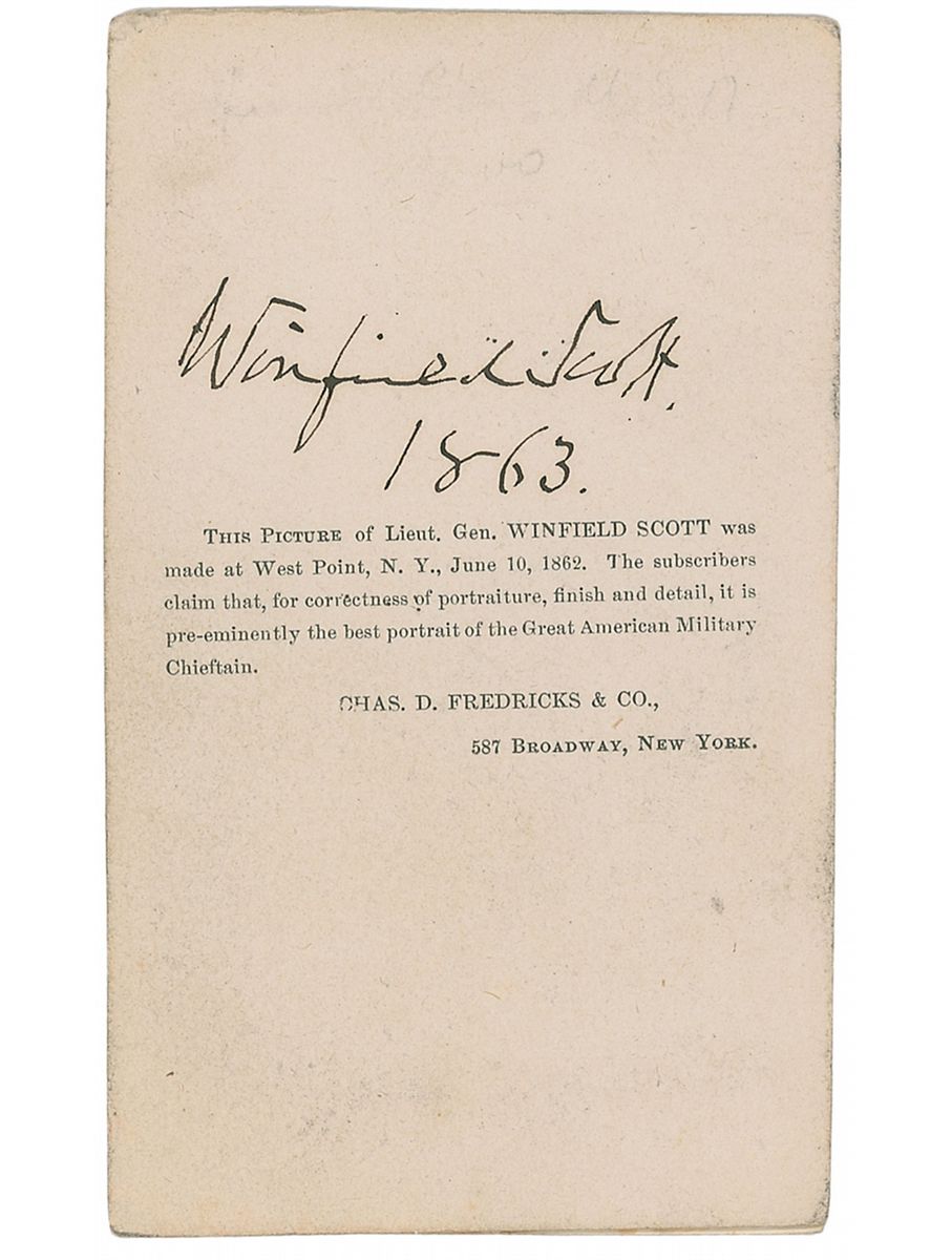 Exceptional 2.5 x 4 carte-de-visite portrait of Scott seated with his sabre by his side, signed on the reverse in bold black ink, “Winfield Scott, 1863.” An ink signature of Scott on an off-white clipped slip is also affixed to the carte-de-visite mount below the image. Published by Chas. D. Fredericks & Co. with a statement printed on the reverse that states this portrait is preeminently recognized as the best portrait of the ‘Great American Military Chieftain.’ In fine condition, with a discolored area to the background of the image.