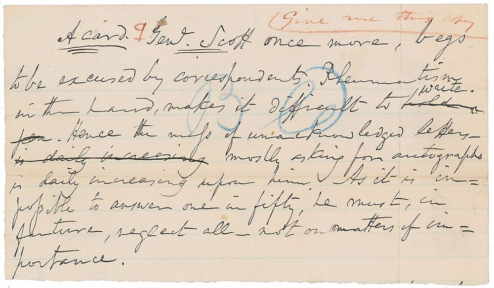 Third-person ALS, signed within the text, “Gen'l Scott,” one page, 7.75 x 4.5, no date but circa February 1863. In full: "A card. Gen'l Scott once more, begs to be excused by correspondents. Rheumatism in the hand, makes it difficult to write. Hence the mess of unacknowledged letters mostly asking for autographs is daily increasing upon him. As it is impossible to answer one in fifty, he must, in future, neglect all—not on matters of importance." In fine condition. This was published in the New York Times on February 26, 1863, as part of the column 'Amusements.; A Card.'