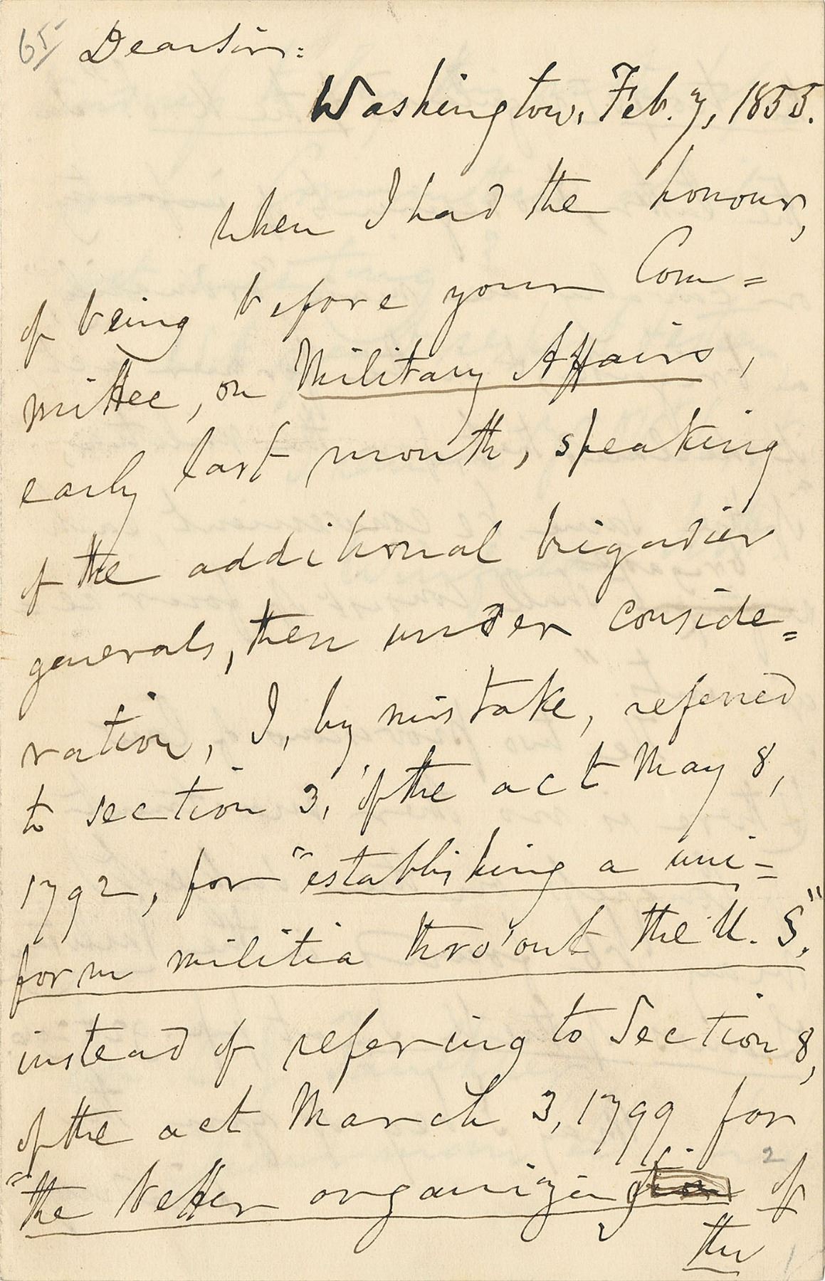 Mexican War and Union commander (1786-1866) nicknamed 'Old Fuss and Feathers' for his love of military pageantry. ALS, three pages on two adjoining sheets, 4.5 x 7, February 7, 1855. Letter to C. J. Faulkner, in full: " When I had the honour of being before your Committee, on Military Affairs, early last month, speaking of the additional brigadier generals, then under consideration, I, by mistake, referred to section 3, of the act May 8, 1792, for 'establishing a uniform militia thro'out the U. S.,' instead of referring to Section 8, of the act March 3, 1799, for 'the better encouraging of the troops (regulars) of the U. S.' In the latter, two regiments of infantry or cavalry are made, 'ordinarily,' a brigade, & in the former act, it declared that, for the militia, 'if the same be convenient, each brigade shall consist of four regiments.' The two provisions of law (& there is no other enactment of Congress on the subject) may be found in the Military Laws of the U. S. at pp. 92 & 296. May I beg of you the kindness to lay this note before your Committee at its next meeting." In fine condition.