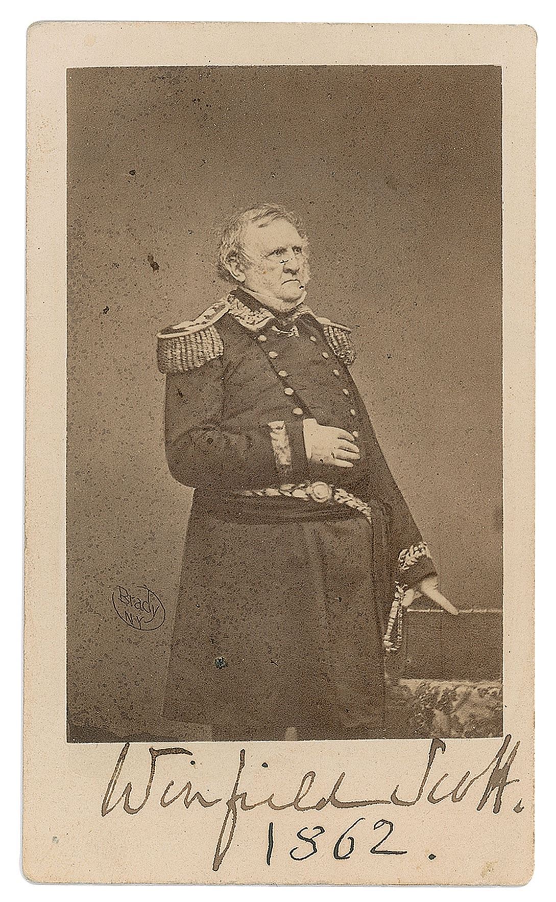 Uncommon 2.5 x 4.25 carte-de-visite half-length portrait of Scott in full uniform by famed Civil War photographer Mathew Brady, signed in the lower border in black ink, "Winfield Scott," with another hand adding the year, "1862." Published by Brady of Washington. Reverse bears a Guille & Alles label. In fine condition, with some light rubbing to the image.