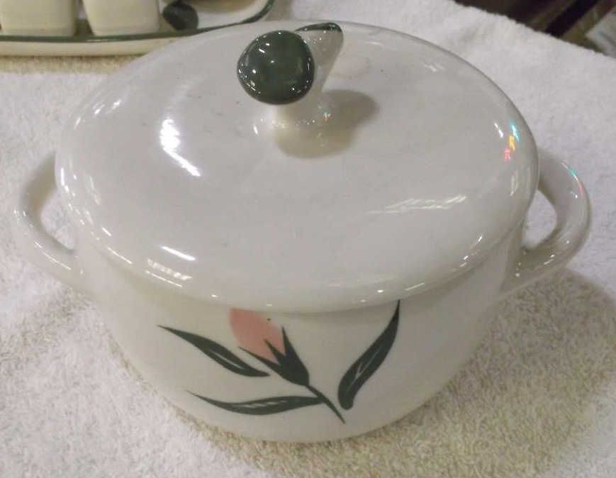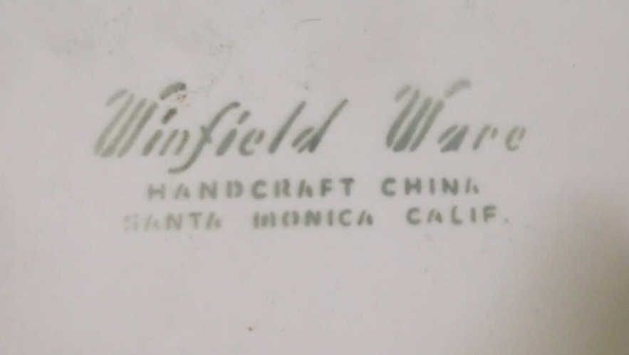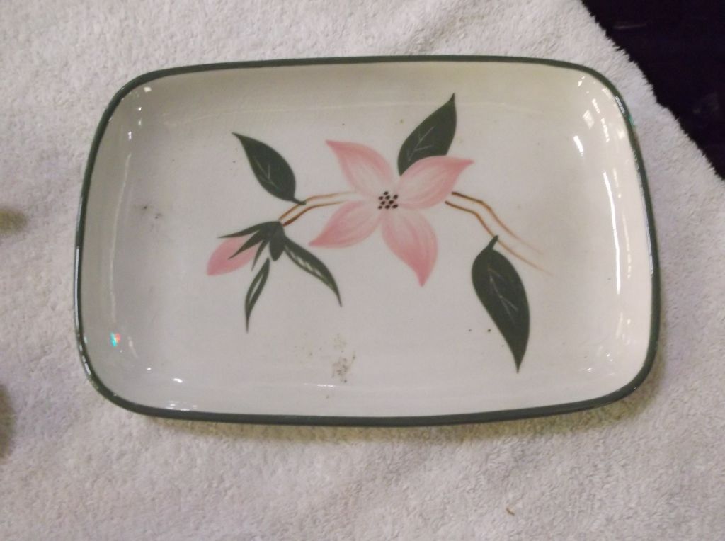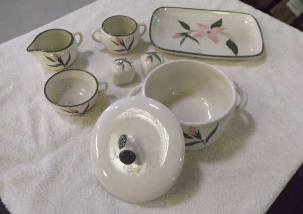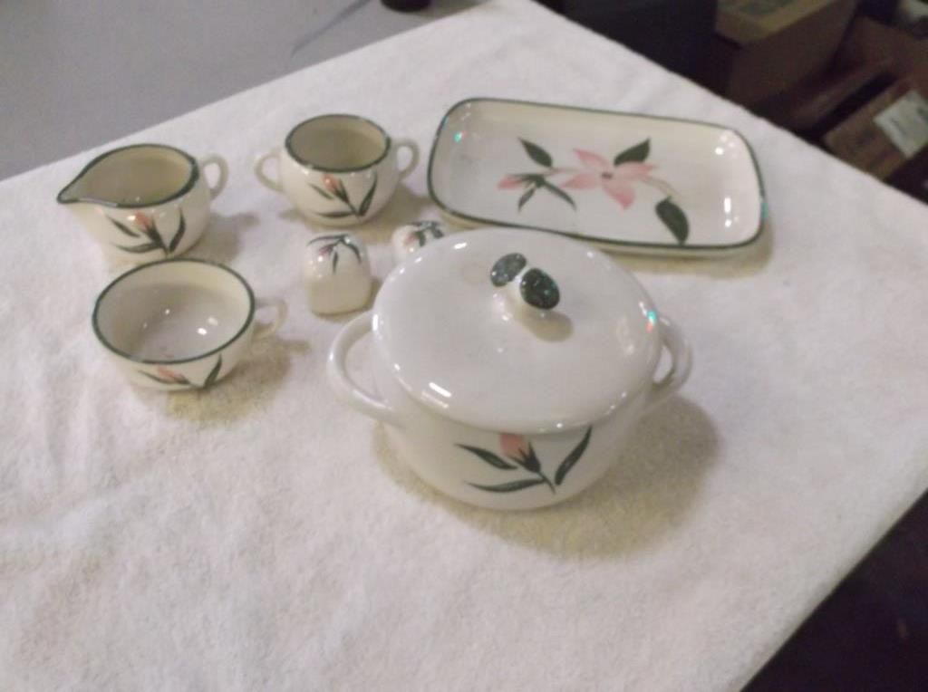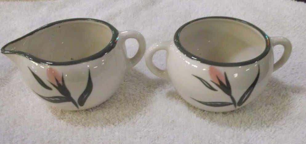 made in Santa Monica Calif. has 1- serving tray 11" x 7", 1- creamer & sugar, 1- cup-1- Salt & Pepper shaker. Pink flower with green leaves...