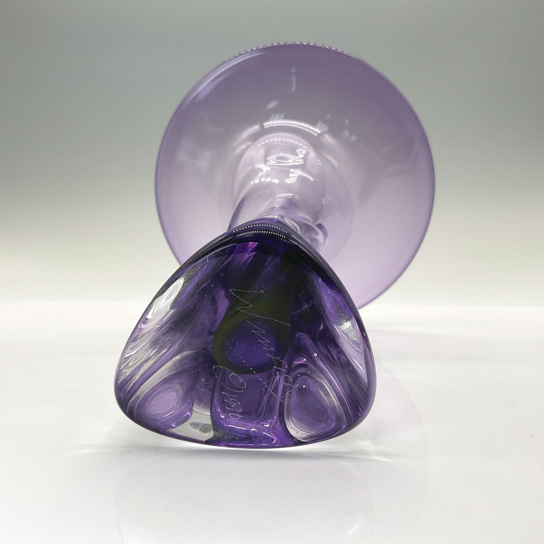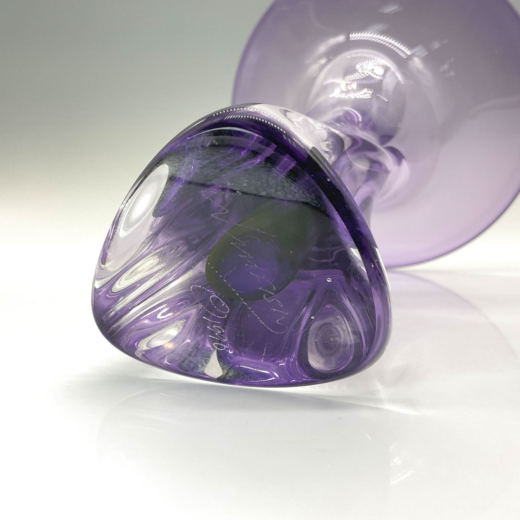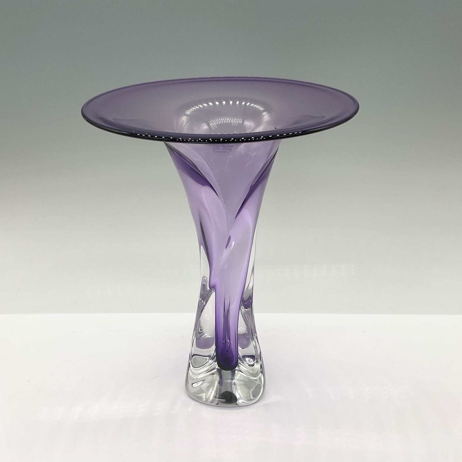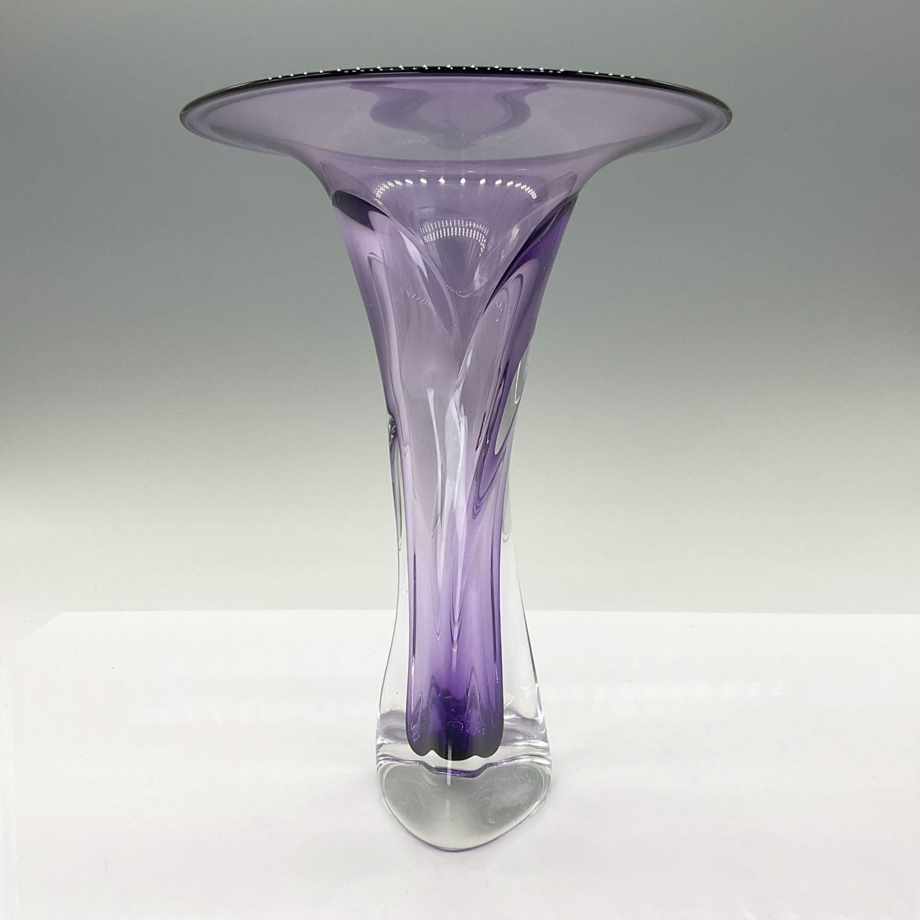 This elegant trumpet-shaped vase, crafted from clear and amethyst-colored glass, is a testament to the artistry of Jonathan Winfisky. Known for his jewel-like colors and sensuous forms, Winfisky has been creating exceptional blown and cast glass sculptures since 1973, with his work featured in renowned museums and collections worldwide.