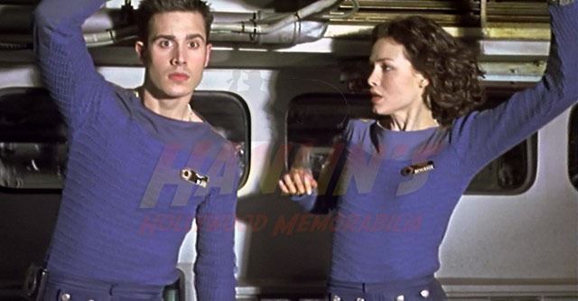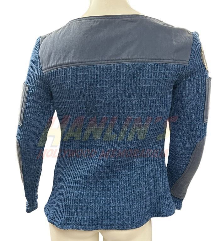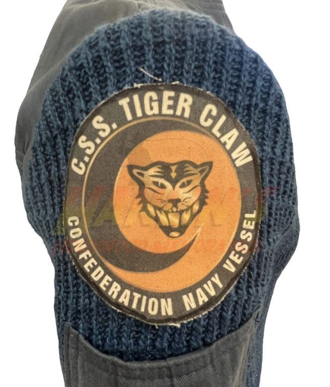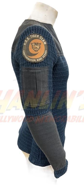 Original sweater and arm patch worn by a crew member of the Tiger Claw in the Chris Roberts created science fiction film 'Wing Commander' (1999), loosely based on the video game series of the same name, where Blair, a fighter pilot, joins an interstellar war to fight the evil Kilrathi who are trying to destroy the universe.