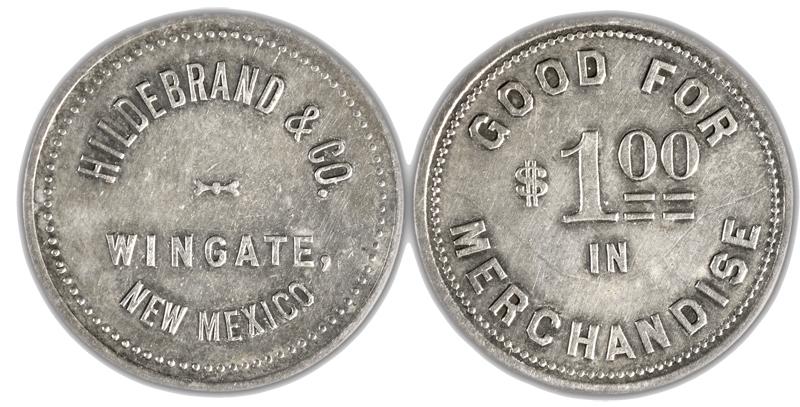 Unlisted. Obverse: Hildebrand & Co. / Wingate / New Mexico; reverse: Good For / $1.00 / In / Merchandise. Al, 35mm. About uncirculated condition, scratch on reverse. Located on the AT & SF Railroad, 12 miles east of Gallup.