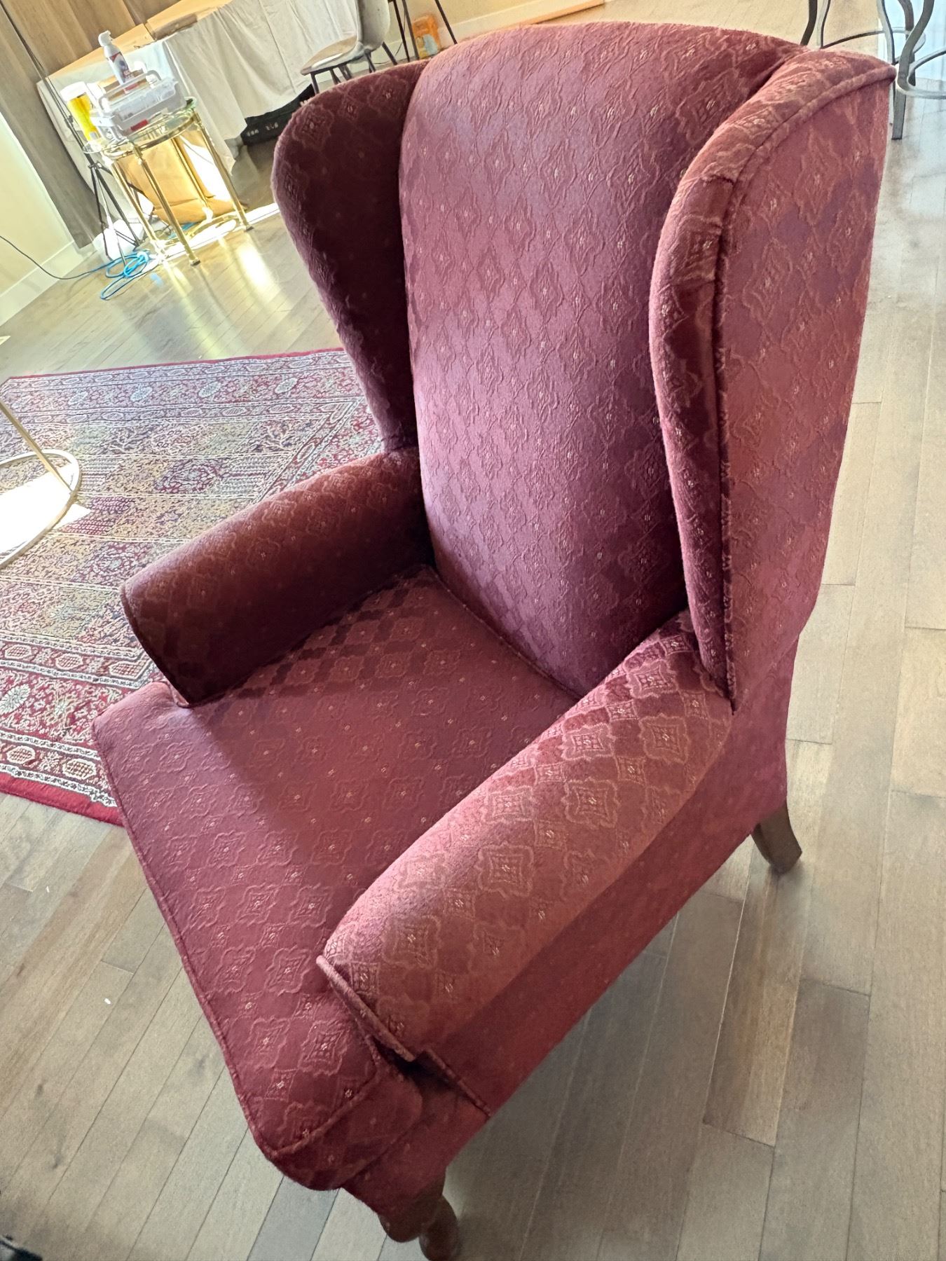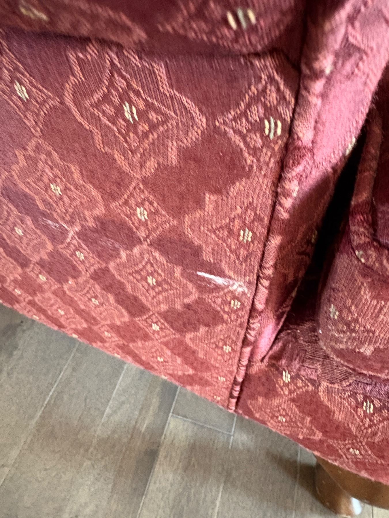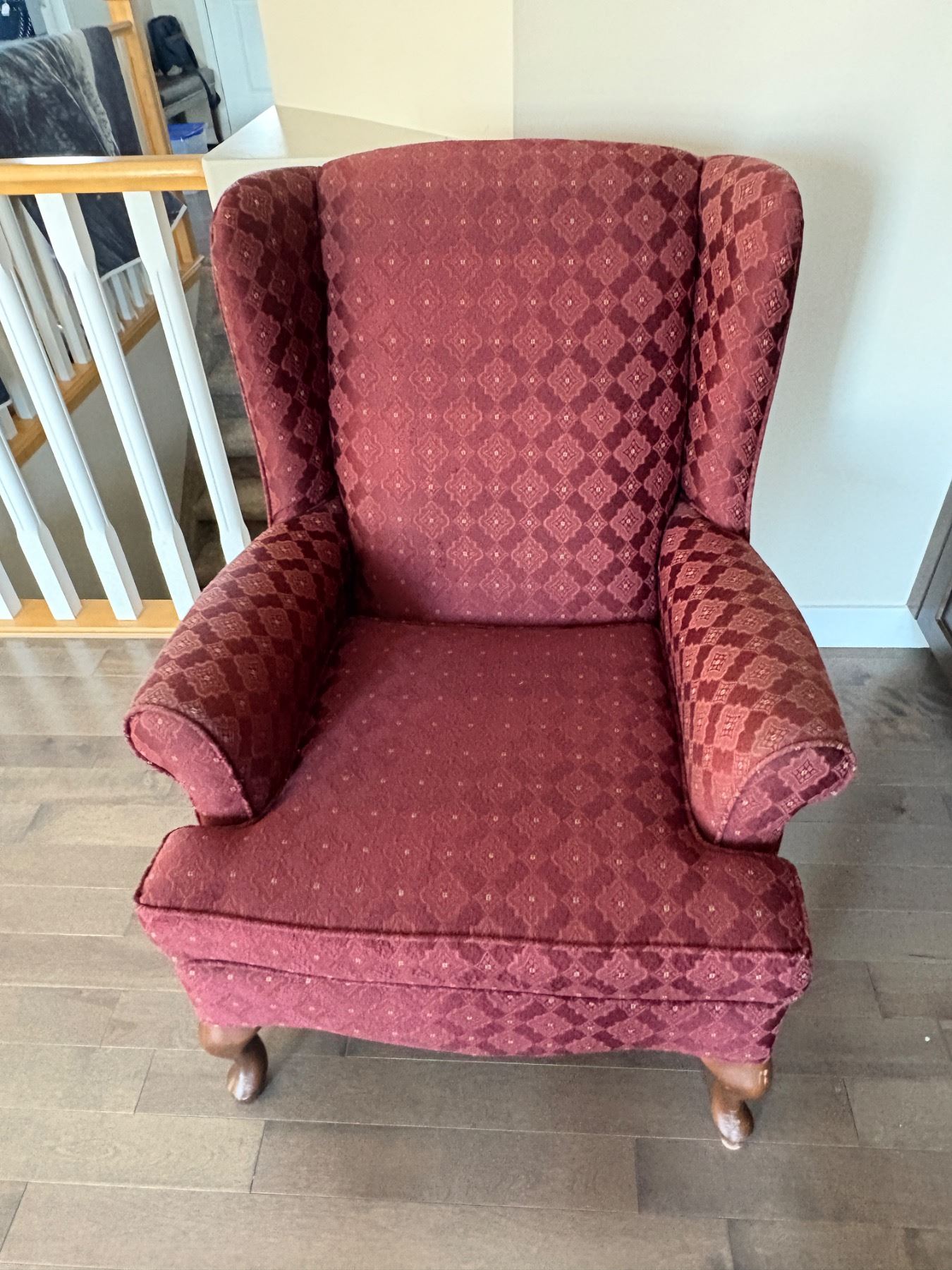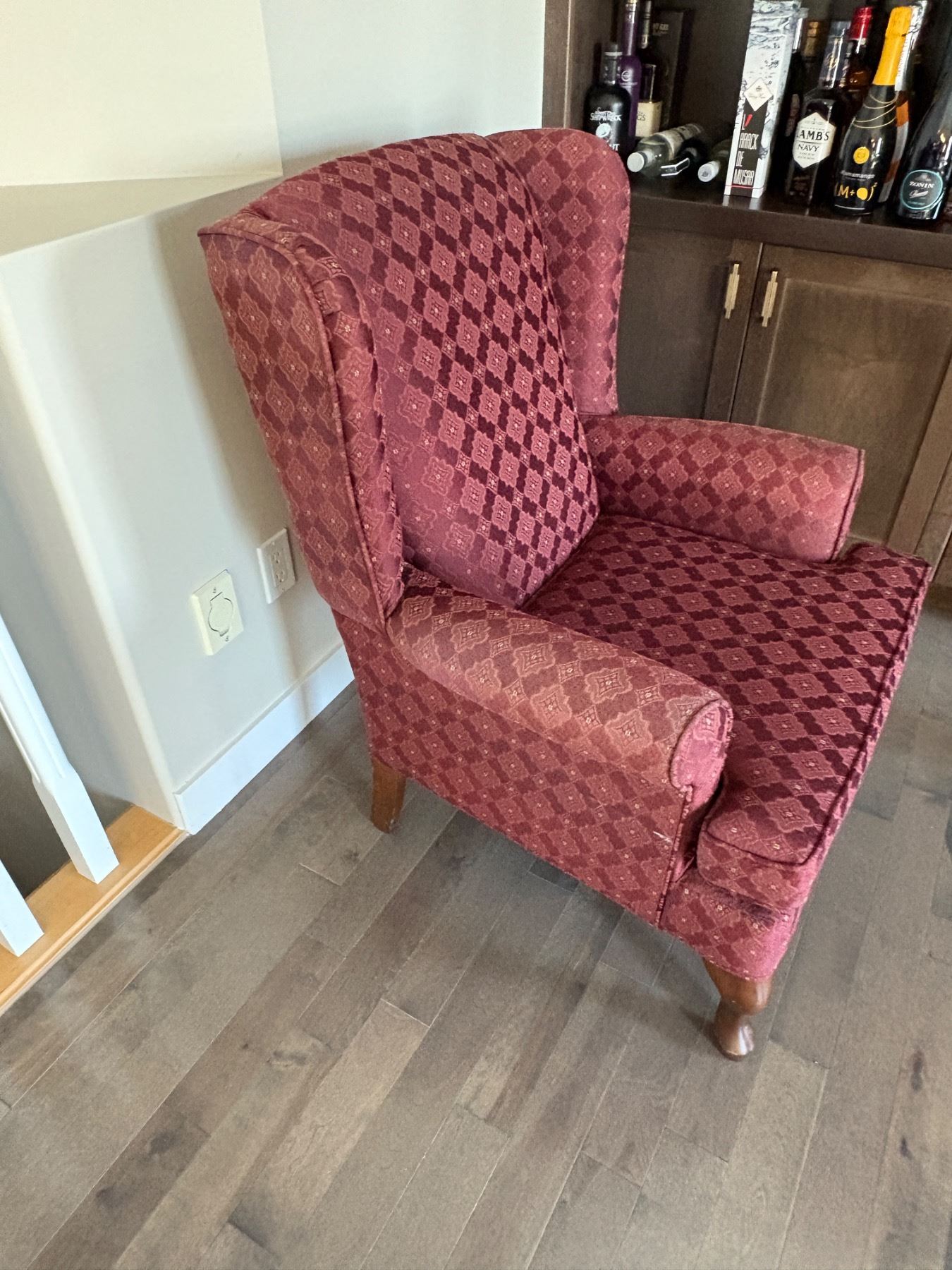 Red wingback chair, showing signs of discolouring, has white scuff on bottom corner. 39"H x 27"w X28"d