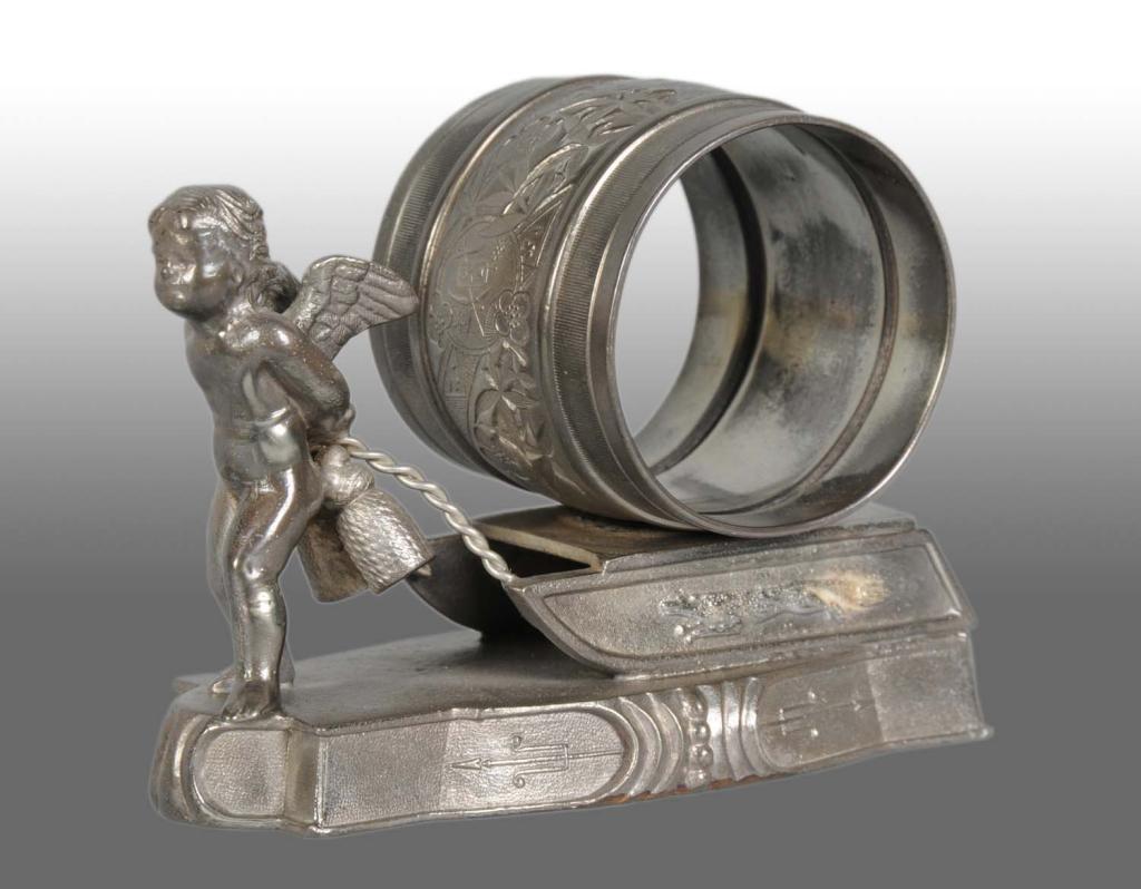 Marked "Meriden Silverplate Co." on base and numbered "284". Depicts winged cherub pulling napkin holder by tasseled rope with a running fox on each side of the sled all on a base. Some silver loss. Condition (Very Good).