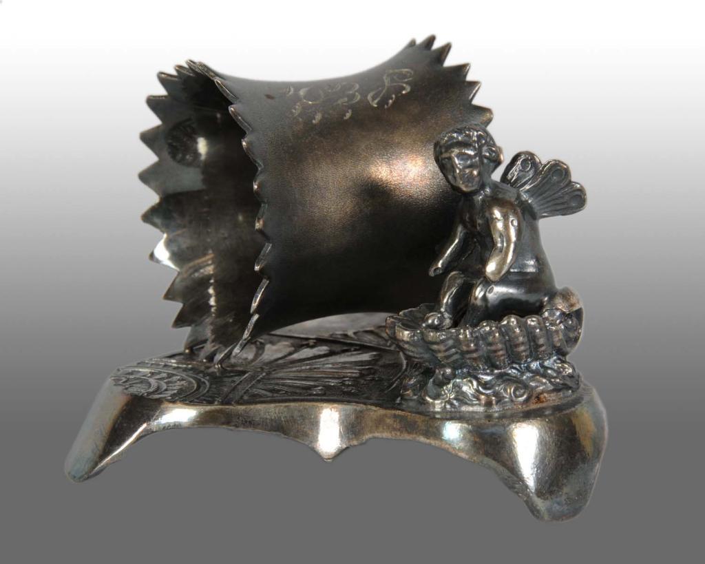 Marked "Manhattan Silverplate Co." and numbered "310". Napkin holder and winged cherub rest on a three-footed raised base. Some silver loss. Condition (Excellent).