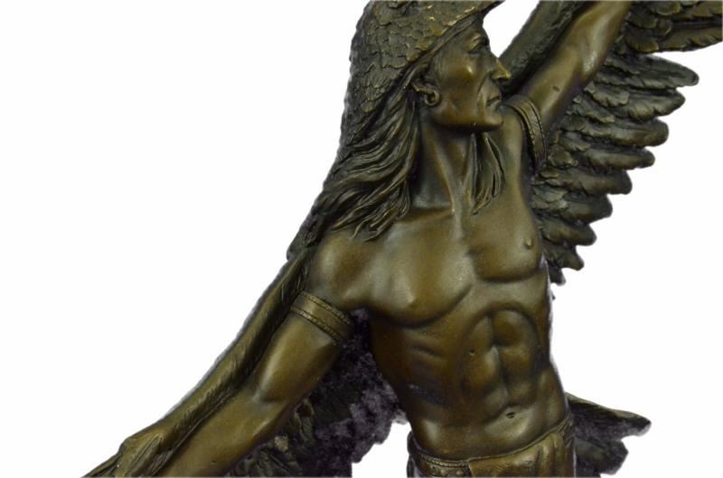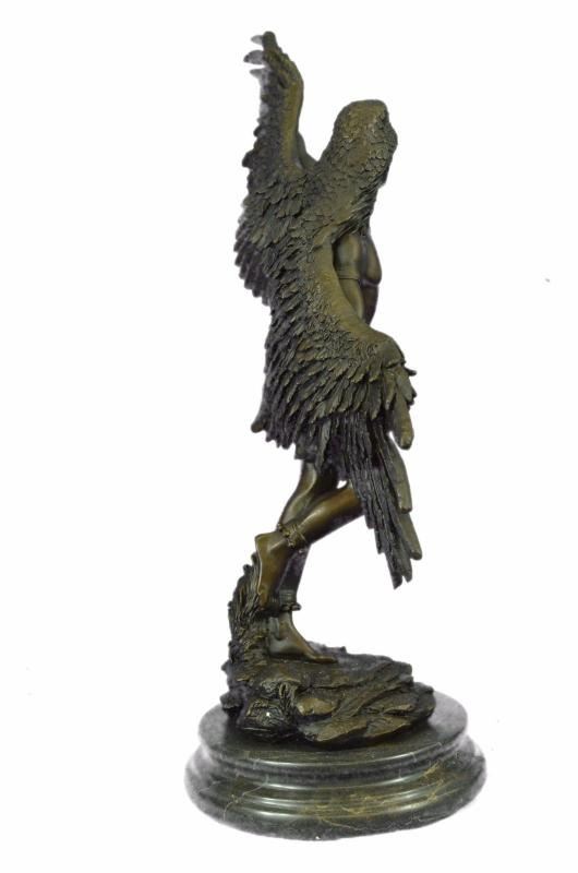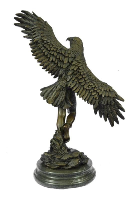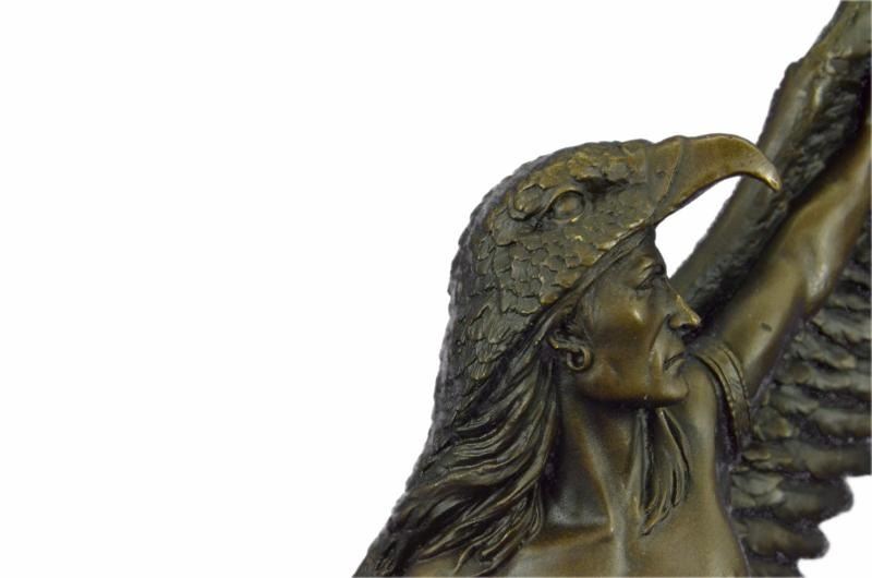 Celebrate the Native American culture with a Native American statue inspired by Indian tribes of the past with this piece that depicts a Native American man wearing eagle fur on his back. He raises his hands out to his sides, mimicking the soaring of an eagle and he looks up to the sky in reverence of the majestic creature. The detail of this skilled artisan shows a wide array of Native American dress as this man wears a belted loincloth, legging boots, a large hunting knife, and the top of the eagle covers the man\'92s head just enough to observe the twisting of his braided hair. This kind of detail is not easy to master. This piece was undoubtedly produced by a highly skilled artisan. Dimensions: Height 19 X Width 17 inches. Weight: 18 LBS.