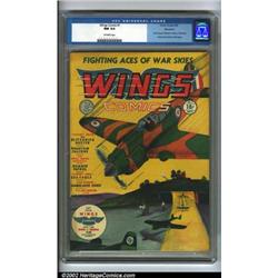 Wings Comics #1 Allentown pedigree (Fiction House, 1940). One of the most popular Fiction House titles, Wings are chock-full of great WWII stories of dogfighting, suicide missions, and basically anything you can imagine involving fighter planes. A great series for any WWII aficionado. This copy hails from the Allentown collection, a small group of books found in 1987 that contained the nicest existing copies of Detective #27 and Captain America #1. With the exception of a light dust shadow on the cover, there are no defects to speak of -- a truly exceptional book to behold. CGC NM 9.4 Off-white pages. Overstreet 2001 NM 9.4 value = $2,200.  Important notice: We expect to be auctioning lots at the rate of 200-250 per hour. Sometimes eBay Premier live bid software cannot keep up with that pace, so we strongly recommend that you place a realistic proxy bid now as insurance to avoid disappointment. Also please note that all Heritage/CAA lots purchased through eBay Premier carry a 20% Buyer's Premium.