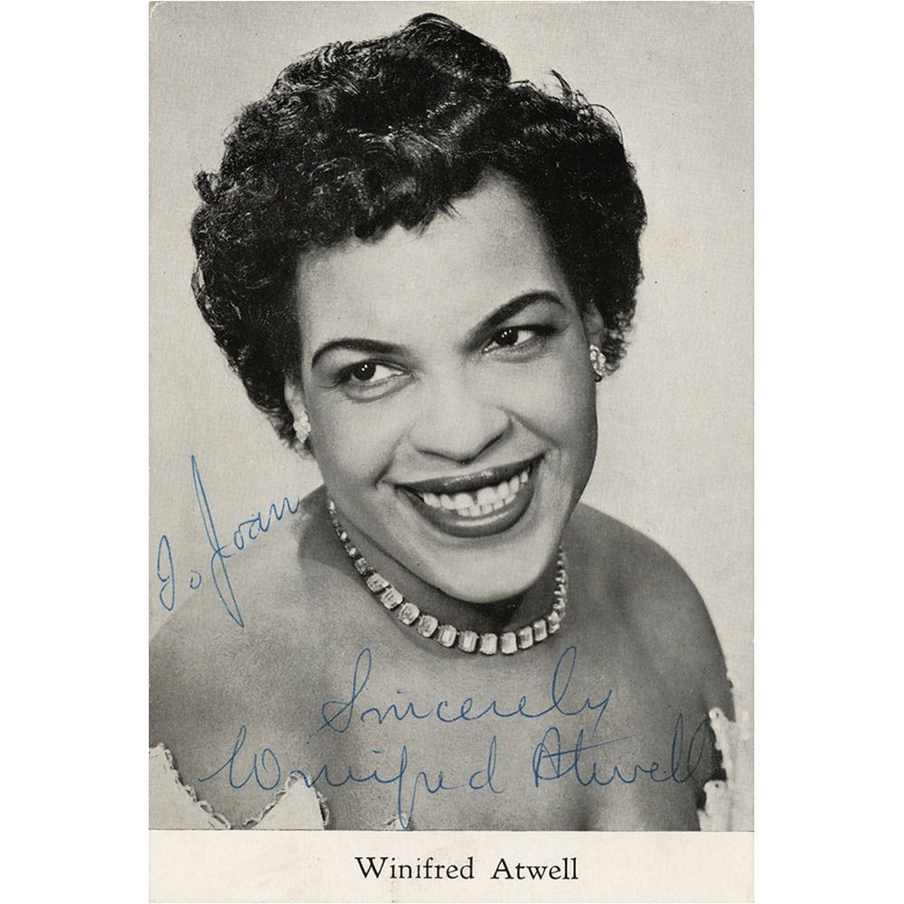Vintage 3.5 x 5 cardstock photo of the boogie-woogie pianist, signed and inscribed in blue ballpoint, "To Joan, Sincerely, Winifred Atwell.” In fine condition, with some small creases and areas of surface loss to reverse. Atwell was the first Black person to have a number one hit in the UK, an achievement earned with her 1954 ragtime single 'Let's Have Another Party.'