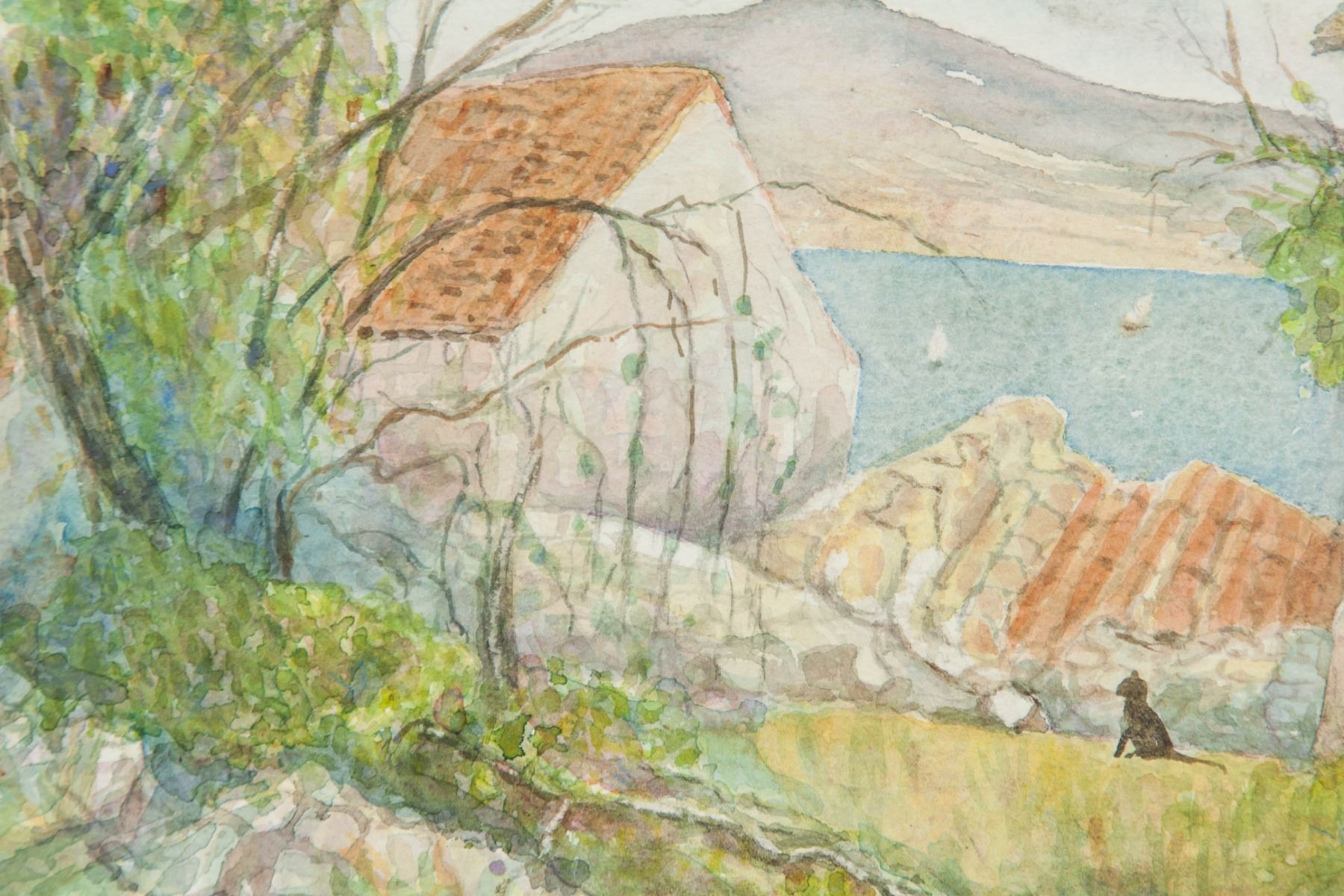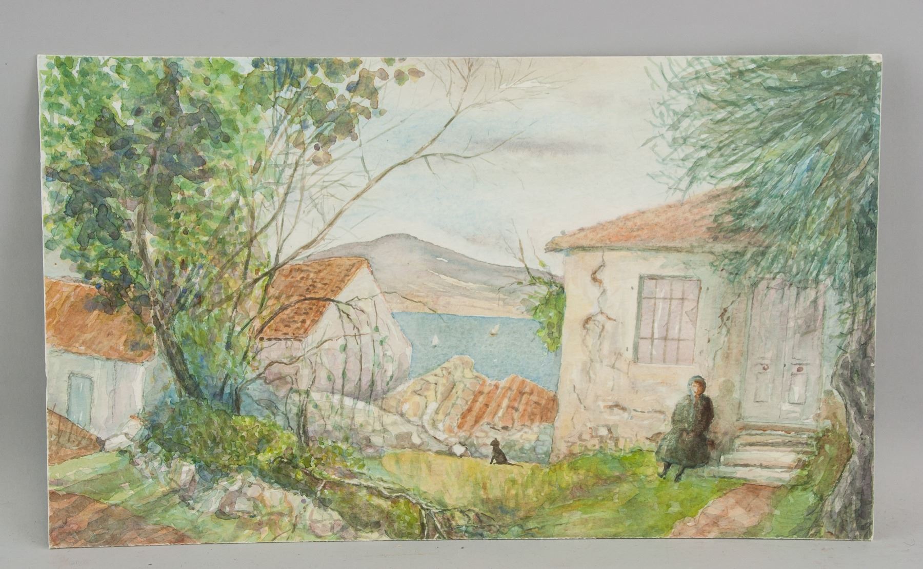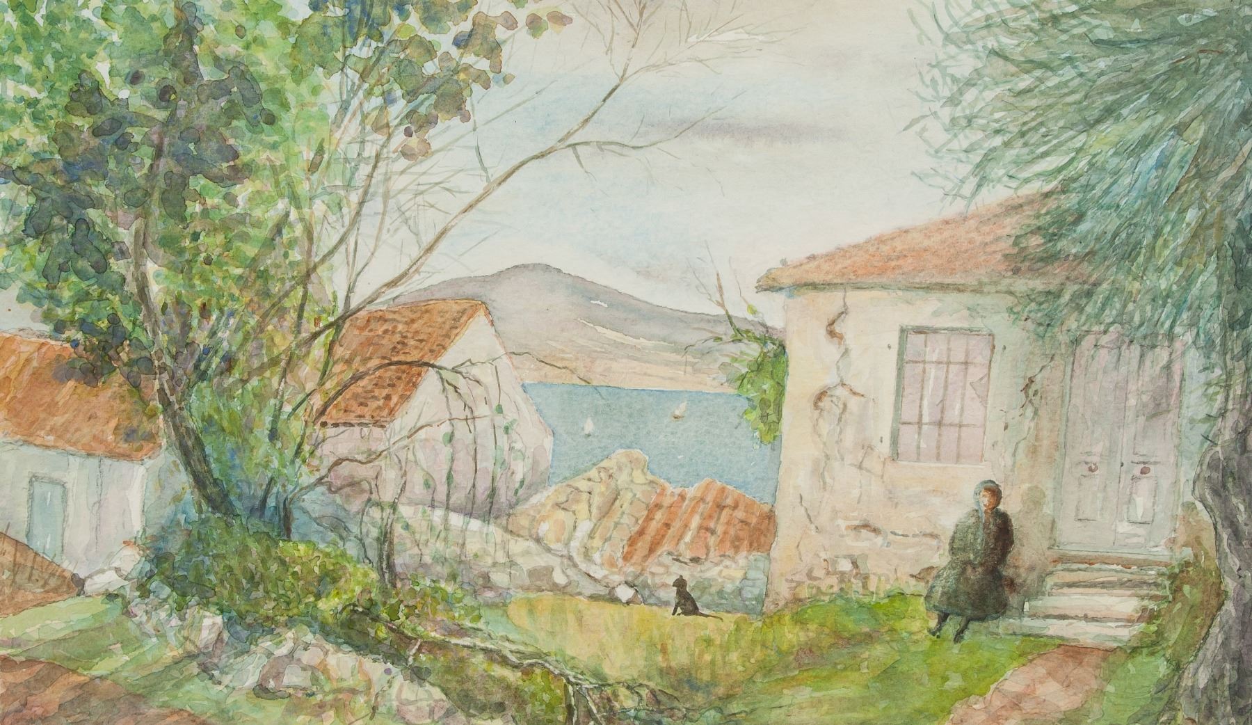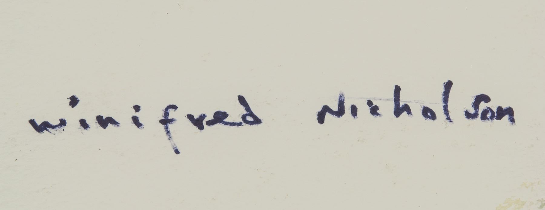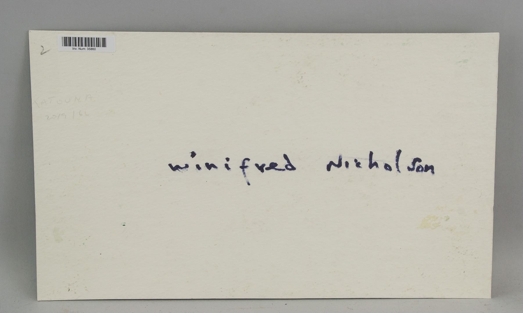 Watercolor on board, featuring harborfront scene. Signed Winifred Nicholson on verso. 8.7 x 14.6 inch (22 x 37 cm). PROVENANCE: Private European collection