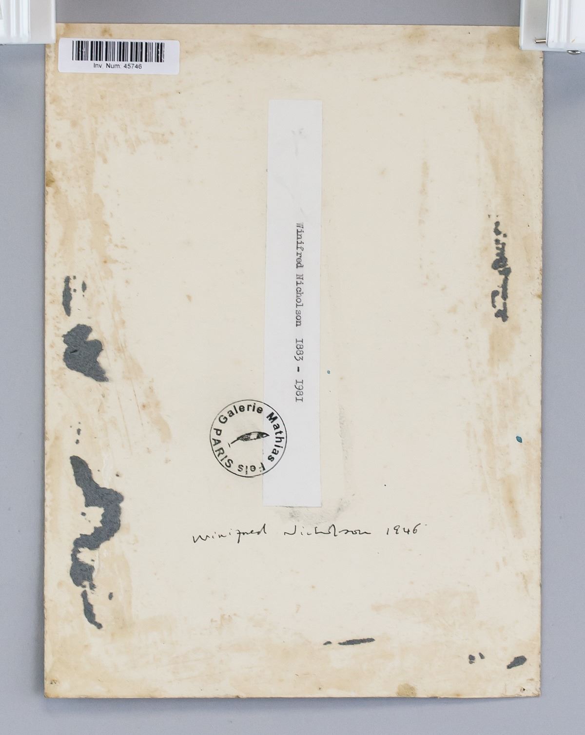 Watercolor on paper. Featuring a landscape scene. Inscribed Winifred Nicholson 1946 on verso. Label affixed to verso inscribed Winifred Nicholson 1883-1981 and stamped Galerie Mathias Fels PARIS, verso. Attributed to Winifred Nicholson (1893-1981, British). 24.5 x 18.5 cm (9.75 x 7.25 in)