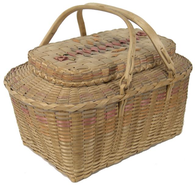 Early/Mid 1900s, Split ash woven construction with ribbon curl decoration on the cover, berry juice dye, and two bent wood ash swing handles. 20" x 14" x 12"
