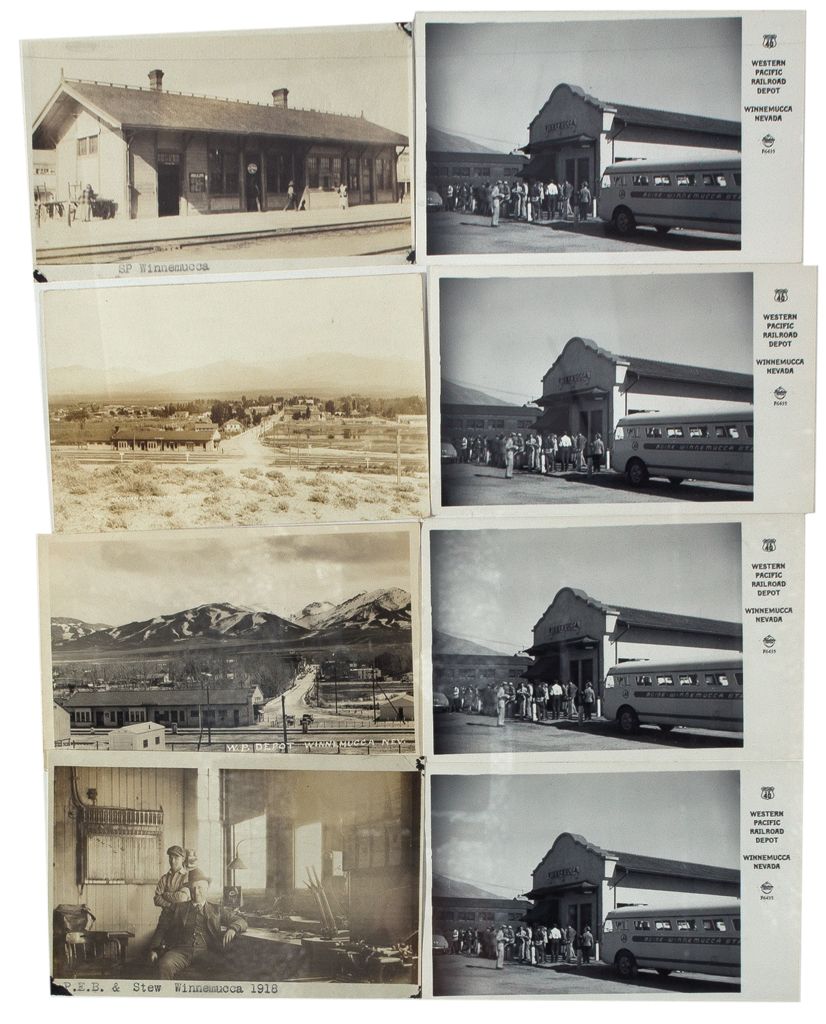 Lot of 8: 1) Four copies of a glossy, unmarked and undated postcard showing a BOISE WINNEMUCCA bus unloading passengers at the Winnemucca WESTERN PACIFIC RAILROAD DEPOT. 2) Another view of the Western Pacific Depot at Winnemucca, from a side angle. 3) A photograph of “P.E.B. & STEW WINNEMUCCA 1918”, marked below the print, shows the depot interior. 4) Postcard marked “PANORAMA WINNEMUCCA, NEVADA, showing a distant view of the Winnemucca station. 5) Photograph of “SP WINNEMUCCA”, likely the Southern Pacific station. - Jacobitz Collection -60134