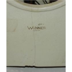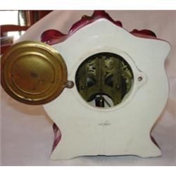 Winner Ansonia china clock. Measures 11 1/4" tall and 9" wide at base. Clock has no key and is marked on back Winner with an approx. 4" hairline crack that is only visible on the outer part of the clock.