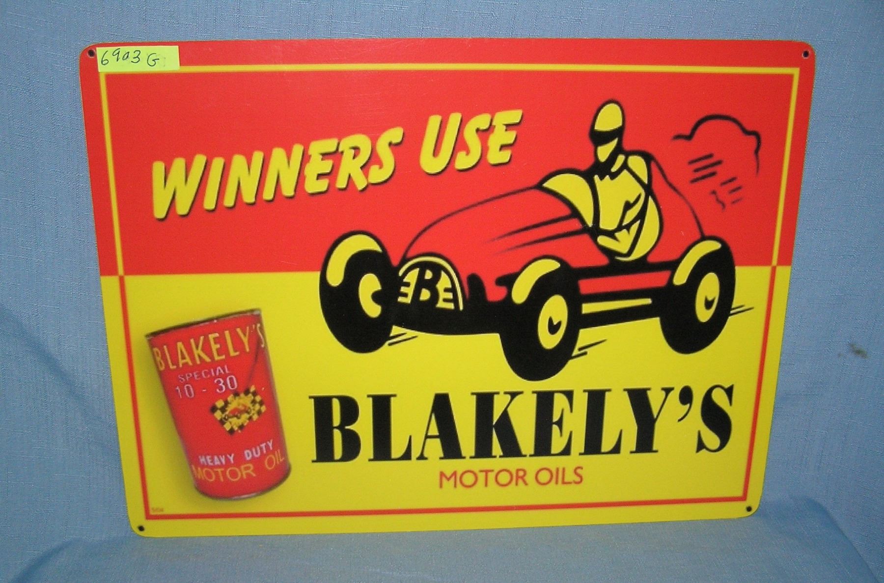 Winner's use Blakelys motor oil retro style advertising sign printed on PVC hardboard these signs are auctioned for their decorative and display purposes 12 inches by 16 inches est. value $50.00-$60.00