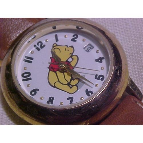 Ladies or childs size Winnie the Pooh Water Resistant Date Watch by Disney Time Works. <p> The goldtone case is 1" in diameter. The date window is at 3:00. It comes on a padded genuien leather band. The band with the watch and the band is 8 1/4" including the buckle. <p> The watch and the band are in excellent condition. <p> I comes running excellently with a brand new quartz battery.