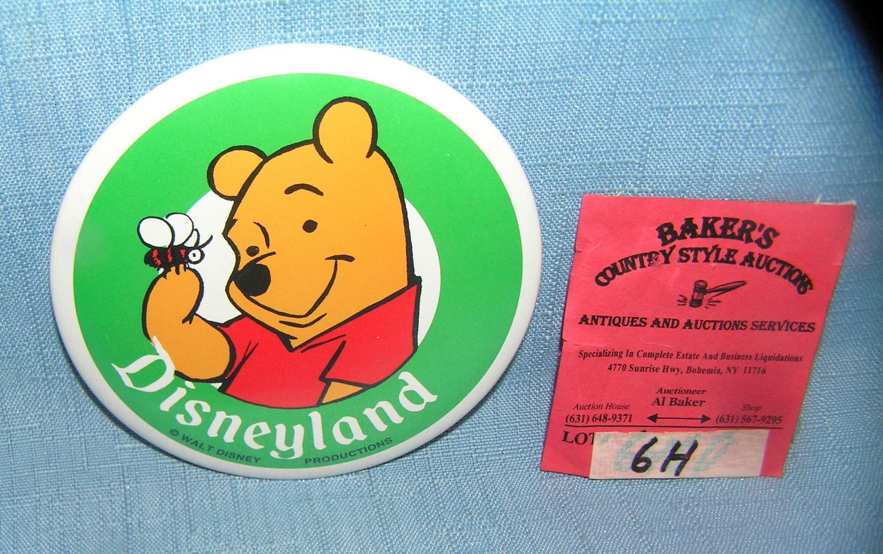 Winnie the Pooh Disneyland pictural pin back button large size, Walt Disney Productions est. value $30.00-$35.00