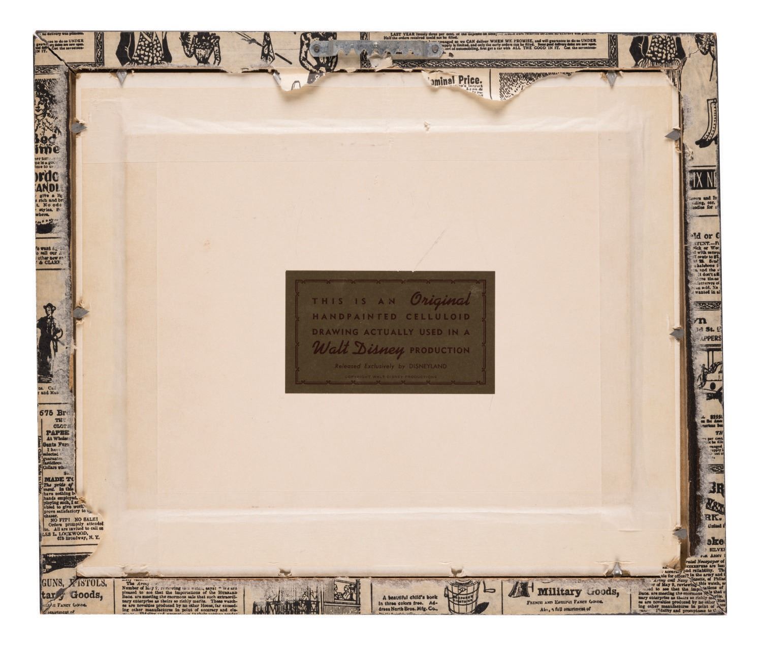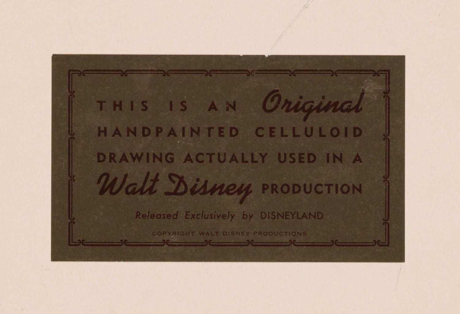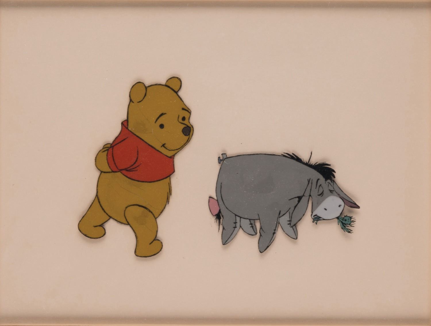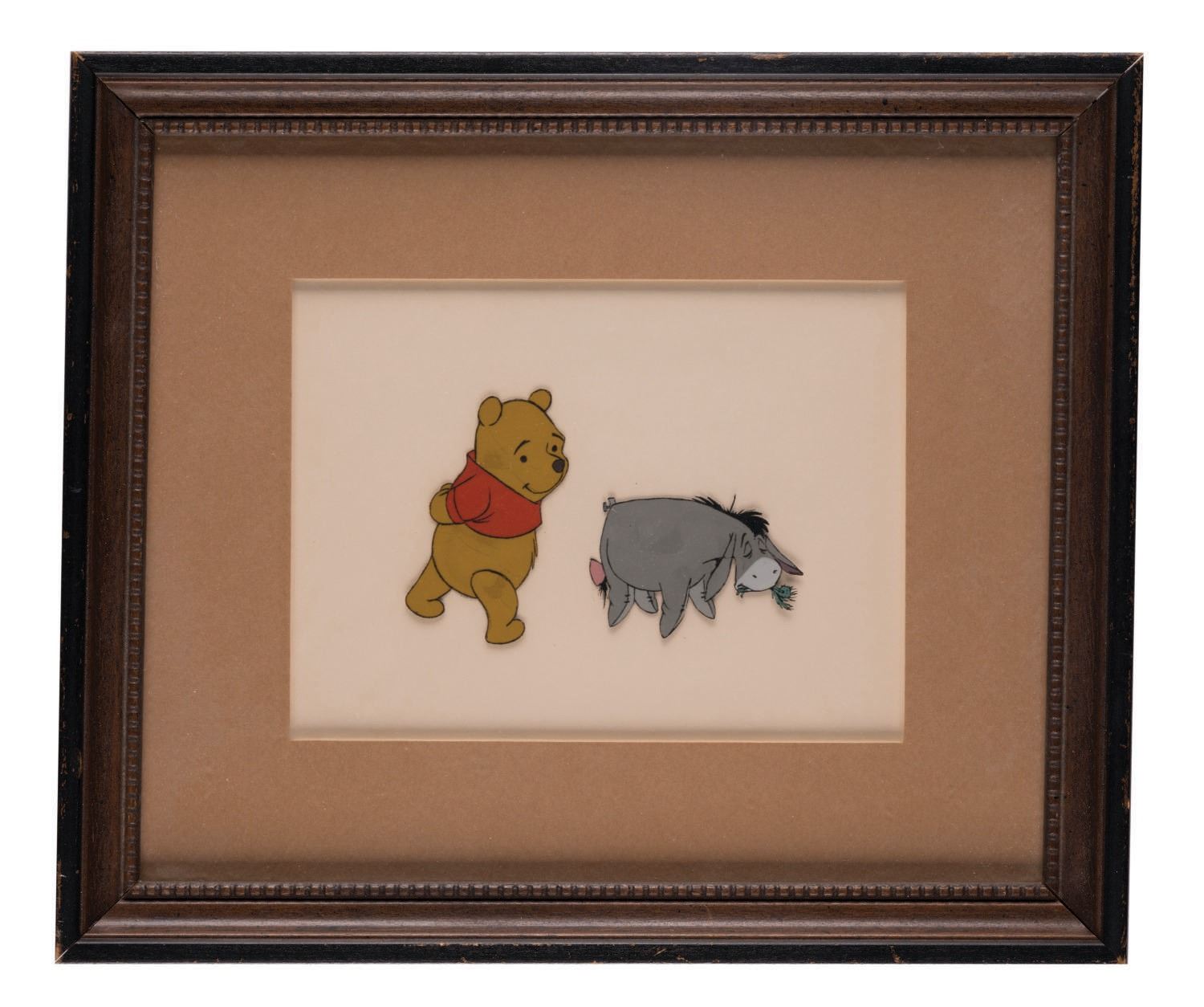 (Disneyland,1960s-70s) An original production cel depicting Winnie the Pooh and the often morose Eeyore. The cel was trimmed and prepared for sale by the Art Corner in Tomorrowland, and remains mounted to its original backing board with a gold Art Corner Label on the reverse. Measuring 6"x7.75" visible through the mat opening with an image size of 3.25"x5", the piece is in good condition. The cel exhibits some cracking and lifting on Winnie, particularly near his shoulder, belly and leg. Eeyore exhibits some subtle lifting near his belly and side. The wooden frame shows surface wear around the edges.