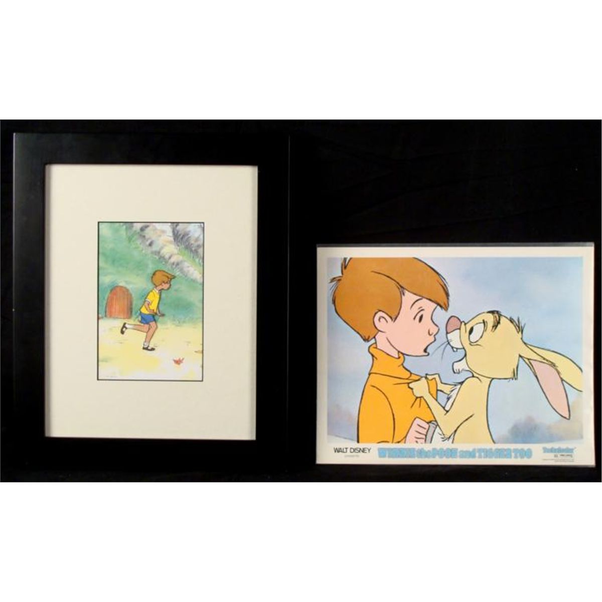 Offered here are two wonderful pieces from the Winnie the Pooh series. First is a 11x14 lobby card of Christopher Robin and Rabbit having a friendly discussion. The lobby card is from the 1974 movie Winnie the Pooh and Tigger Too. The other item is a framed Christoper Robin cel. The frame is black, it measures out to be 13 3/4" x 16 3/4", with a very minor chip to the left side. The image measures out to be 5 1/2" x 8" and has been matted. The lobby card is in near mint condition and is in a protective sleeve and the framed cel is in excellent condition. *