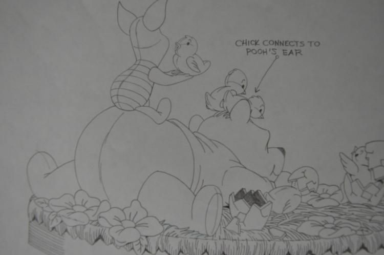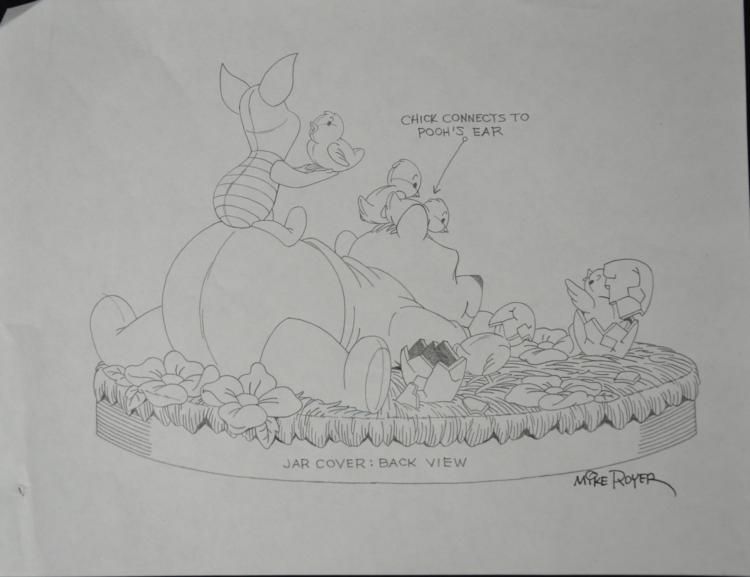 This original drawing is from a design for a Winnie the Pooh Jar, signed by the artist. This is a back view of the jar cover, showing Pooh and Piglet with newly hatching chicks. * Artist: Mike RoyerSignature: In black ink lower rightMedium: Black pencil on paperSheet size: 8 1/2 x 11 inchesCondition: Very good, with crease and small torn spot, lower left
