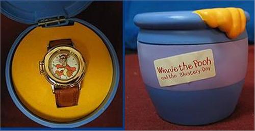 Winnie the Pooh Tigger watch in the honey pot. Tigger watch has a leather band measuring 9" and is made exclusively by Walt Disney World according to the back of the watch