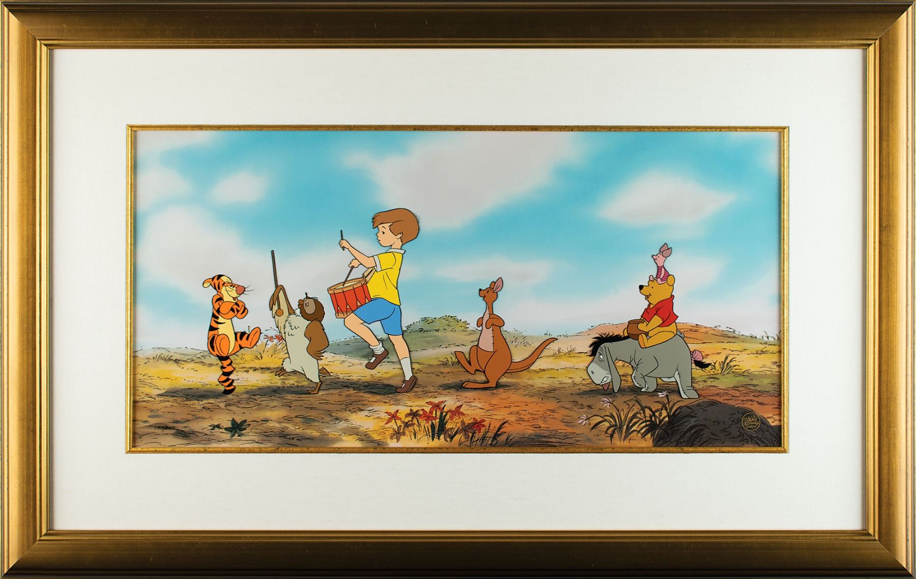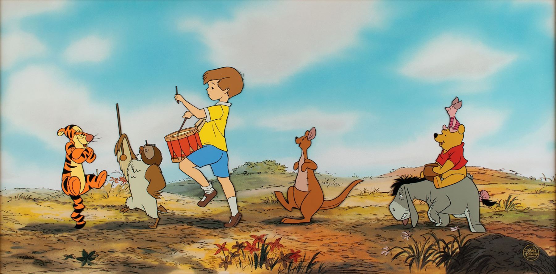 (Walt Disney Studios, 1996) Original limited edition hand-painted cel entitled 'Pooh Bear Parade,' numbered 190/500, showing Pooh, Piglet, Eeyore, Kanga, Owl, Tigger, and Christopher Robin marching through the Hundred Acre Wood. The cel is placed on its matching Disney litho background. Images measure from 2 x 4 to 3.5 x 6.75, with a mat opening of 23.25 x 11.25. Framed to an overall size of 33 x 21. The piece has the gold Walt Disney Company seal to lower right. In fine condition. Accompanied by a certificate of authenticity from The Walt Disney Company.