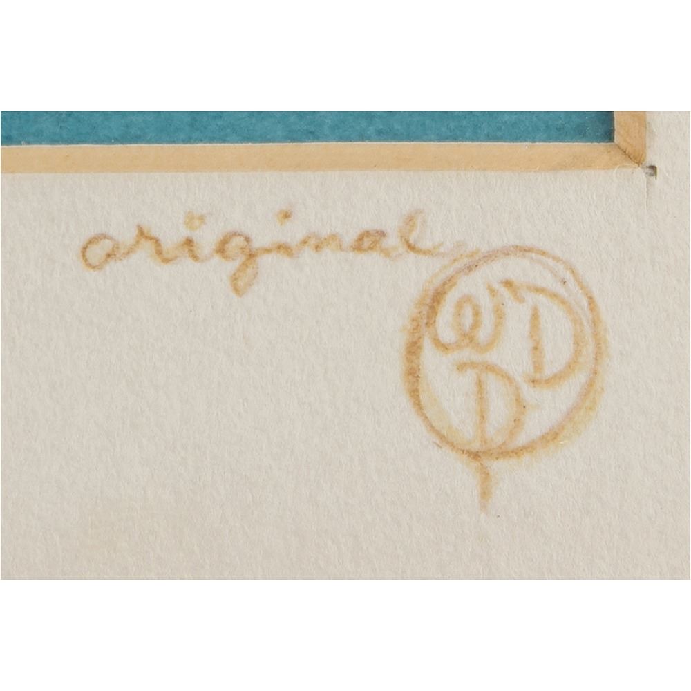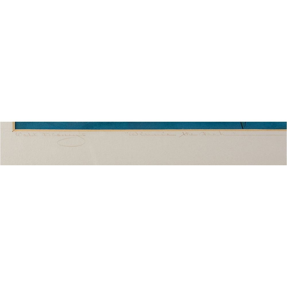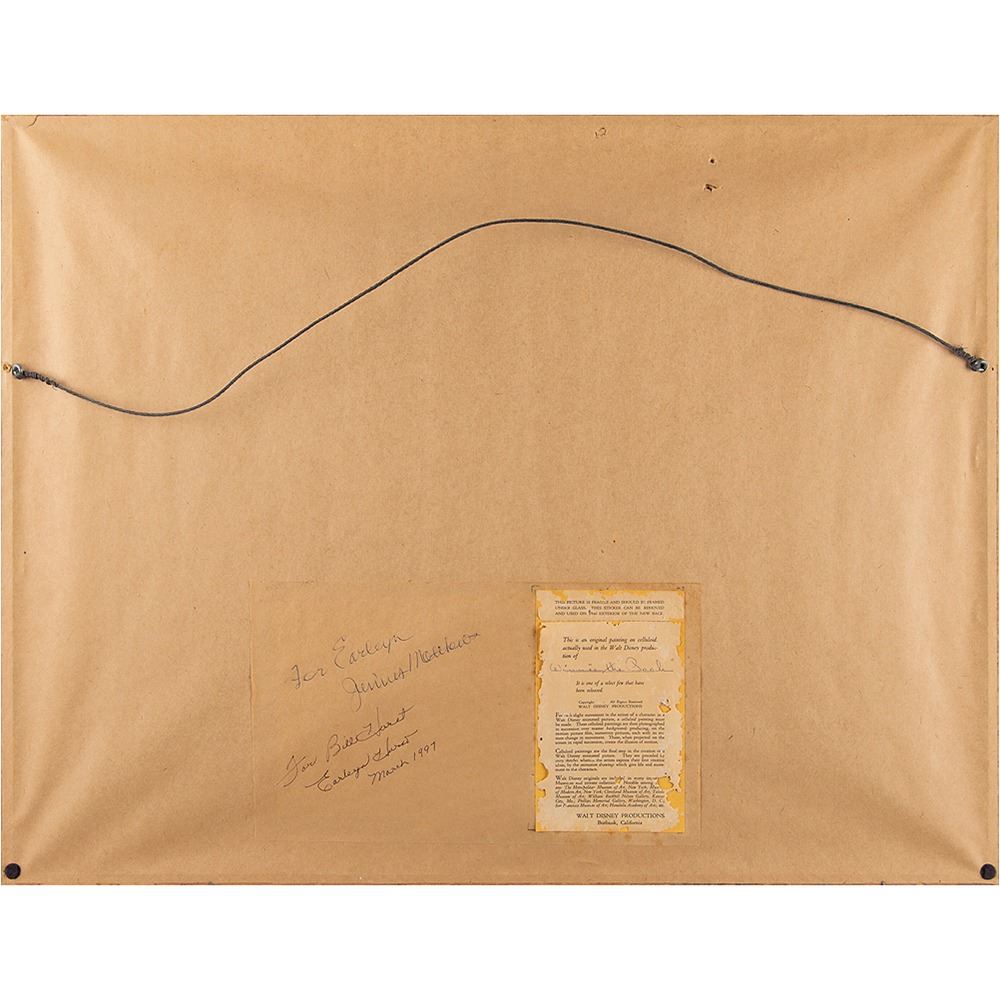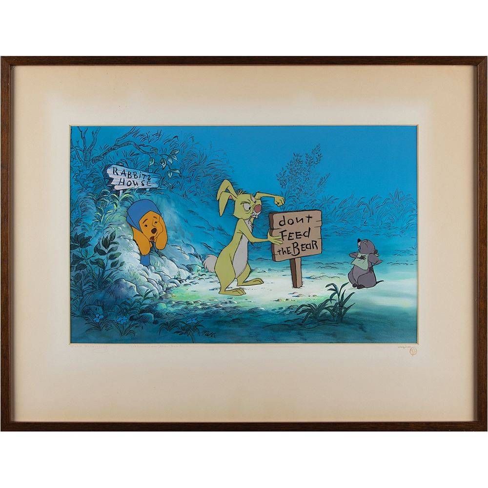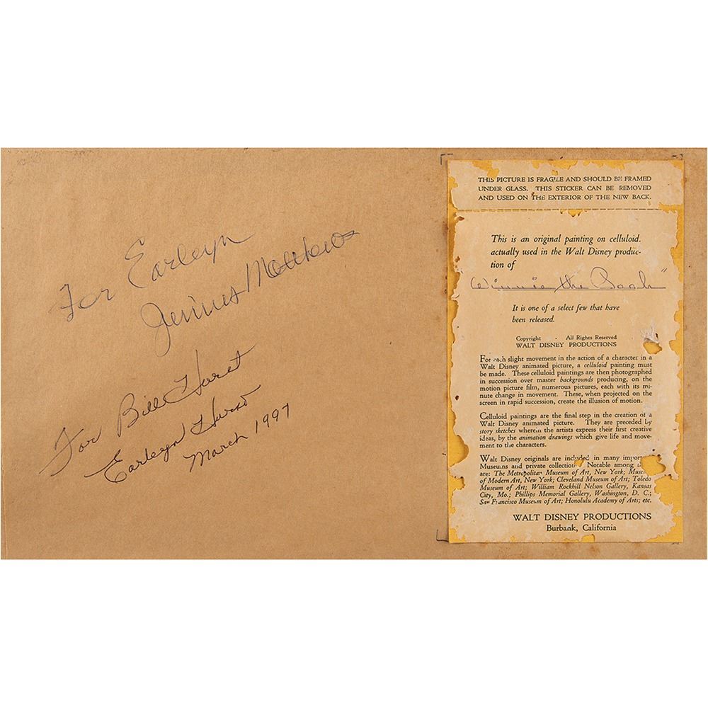 (Walt Disney Studios, 1966) Original production cels and key master background featuring Winnie the Pooh, Rabbit, and Gopher from the animated featurette Winnie the Pooh and the Honey Tree, the last short film produced by Walt Disney. The cels are trimmed and applied to a hand-painted key master production background from film. The scene shows Winnie-the-Pooh gloomily stuck in "Rabbits House," Rabbit pounding a "Dont Feed the Bear" sign into the ground, and Gopher pleasantly observing all the action. Displayed in its original Walt Disney mount, annotated, "Walt Disney's 'Winnie the Pooh,'" with an "Original WDP" stamp to lower right. Character images range from 1.5 x 2.5 (Gopher) to 6 x 5.75 (Rabbit with sign) with a mat opening of 17.25 x 11. Framed to an overall size of 24.5 x 18.75, with the original Walt Disney Productions label on the reverse. Also signed and inscribed on the reverse in ballpoint by Junius Matthews, "For Earleyn, Junius Matthews," with a later presentation inscription by Earleyn below. Matthews was the original voice of Rabbit in the Winnie the Pooh franchise from 1966 to 1977. In fine condition.