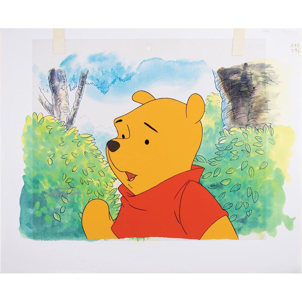 (Walt Disney Studios, 1988) Original production cel featuring Winnie the Pooh from The New Adventures of Winnie the Pooh, which depicts Pooh in a large half-length pose. Image measures 7 x 6.5, with overall dimensions of 13.5 x 11. The cel is placed on a matching Disney litho background of Hundred Acre Wood; reverse bears a Walt Disney Television label. The piece has the silver Walt Disney Television seal to lower left. In fine condition.