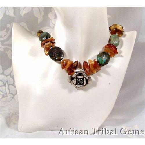 Vera has chosen GENUINE Baltic amber complimented with the finest of tribal sterling. The center hilltribe rose has a diameter of 34mm. The necklace is finished to perfection with a 22mm sterling s hook closure. For those not familiar to metric 25mm=1".