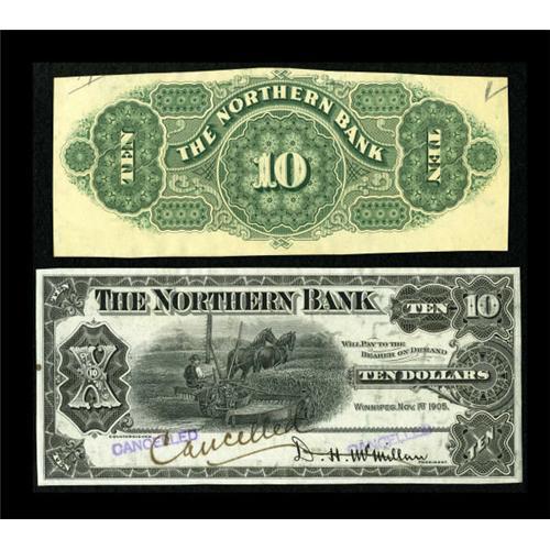 <B>Winnipeg, MB- The Northern Bank</B></I> $10 Nov. 1, 1905 Ch. # 540-10-04P Face and Back Proofs.<BR> This is a gorgeous pair of proofs that will have to suffice as issued notes from this institution in this denomination are very scarce. A slight corner bend is noticed on the face proof while the back proof is cut a bit askew. <B>Crisp Uncirculated</B></I>.<BR><BR><b>Shipping:</b> Coins & Currency (<a target="_blank" href="http://www.heritageauctions.com/common/shipping.php">view shipping information</a>)