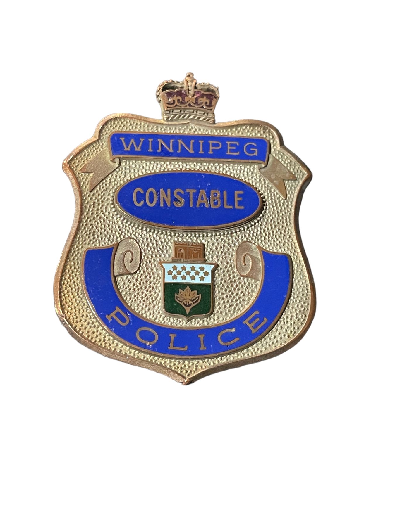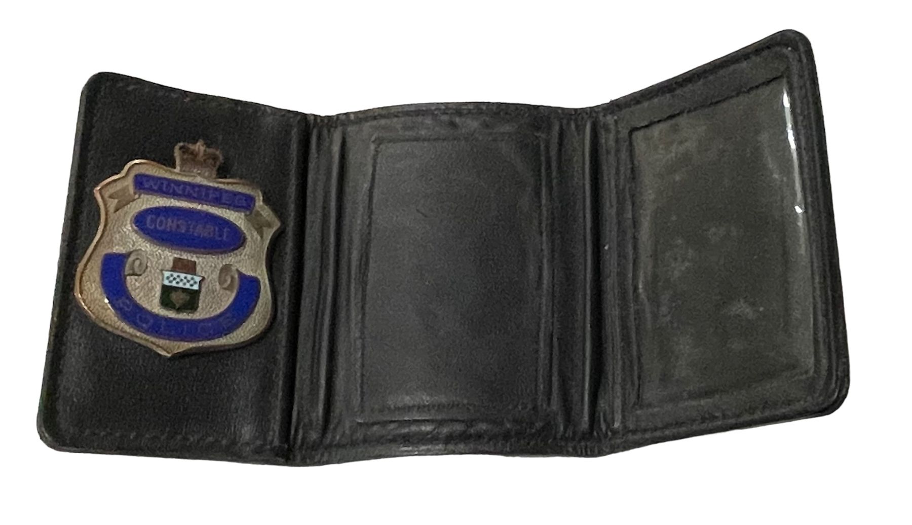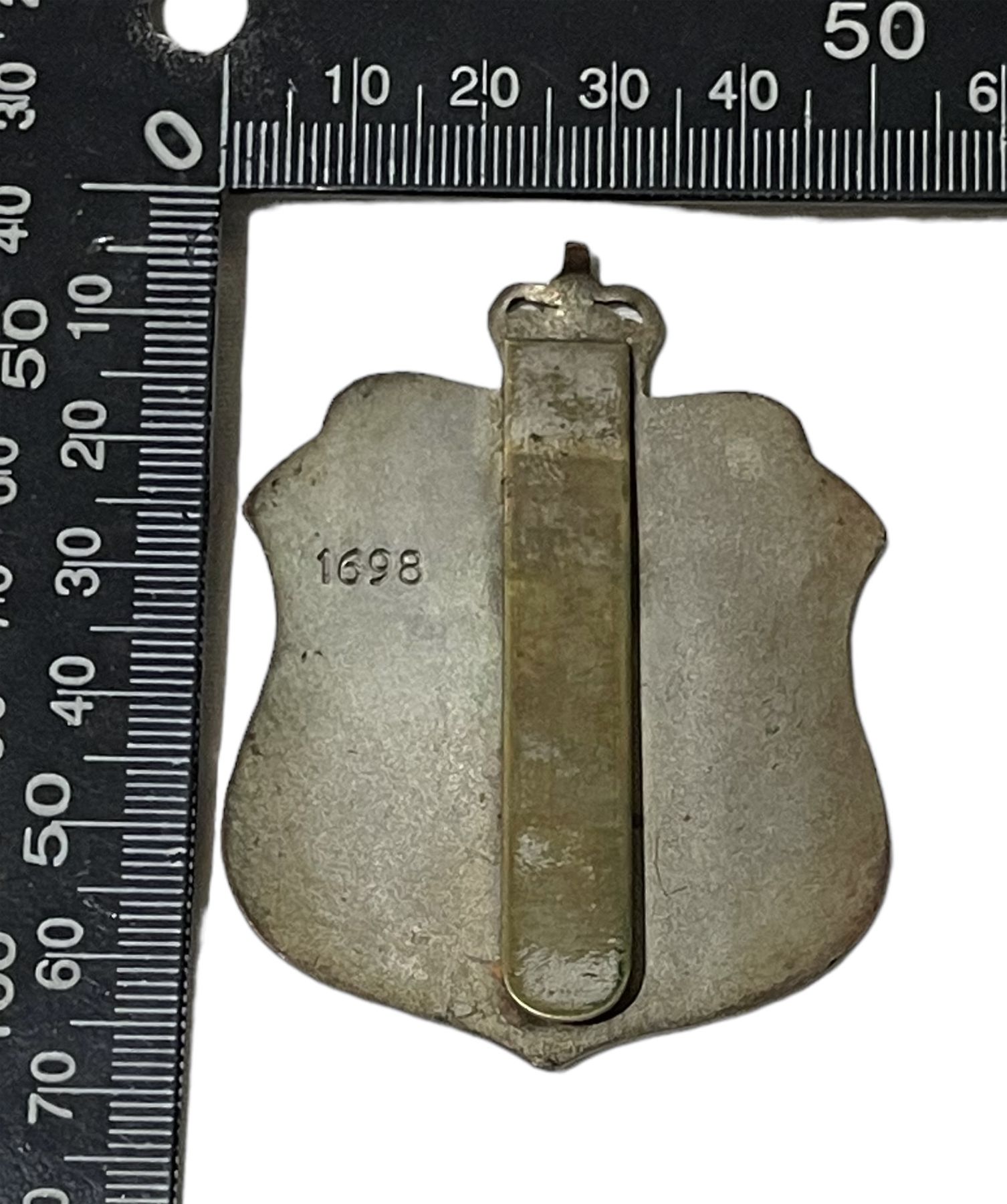 Manitoba. Worn brass metal with enamels. Slider fastener. Numbered 1698. In wallet