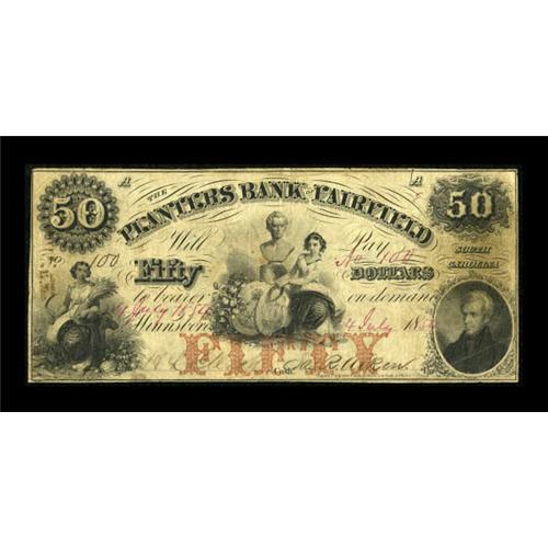 <B>Winnsboro, SC- Planters Bank of Fairfield </B></I>$50 July 4, 1854 G10a Sheheen 313<BR> A truly scarce note which is seldom available. Pleasing <B>Fine+, </B></I>with a couple of minor splits at the top. <BR><BR><b>Shipping:</b> Coins & Currency (<a target="_blank" href="http://www.heritageauctions.com/common/shipping.php">view shipping information</a>)