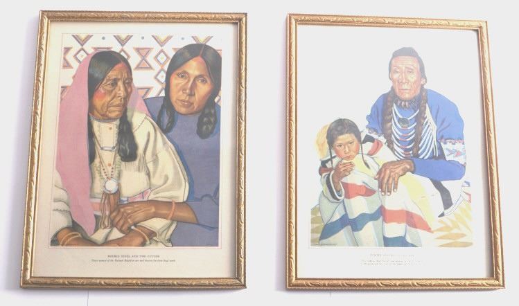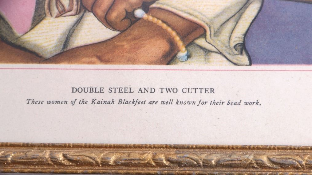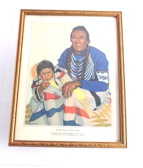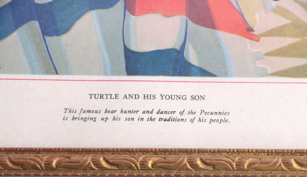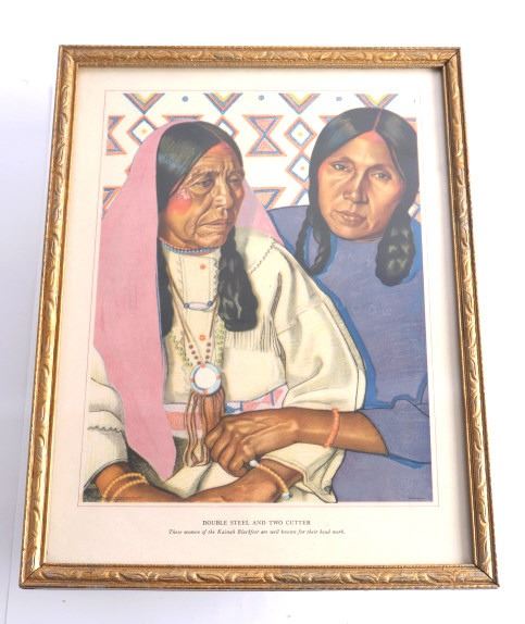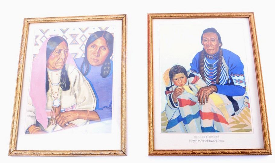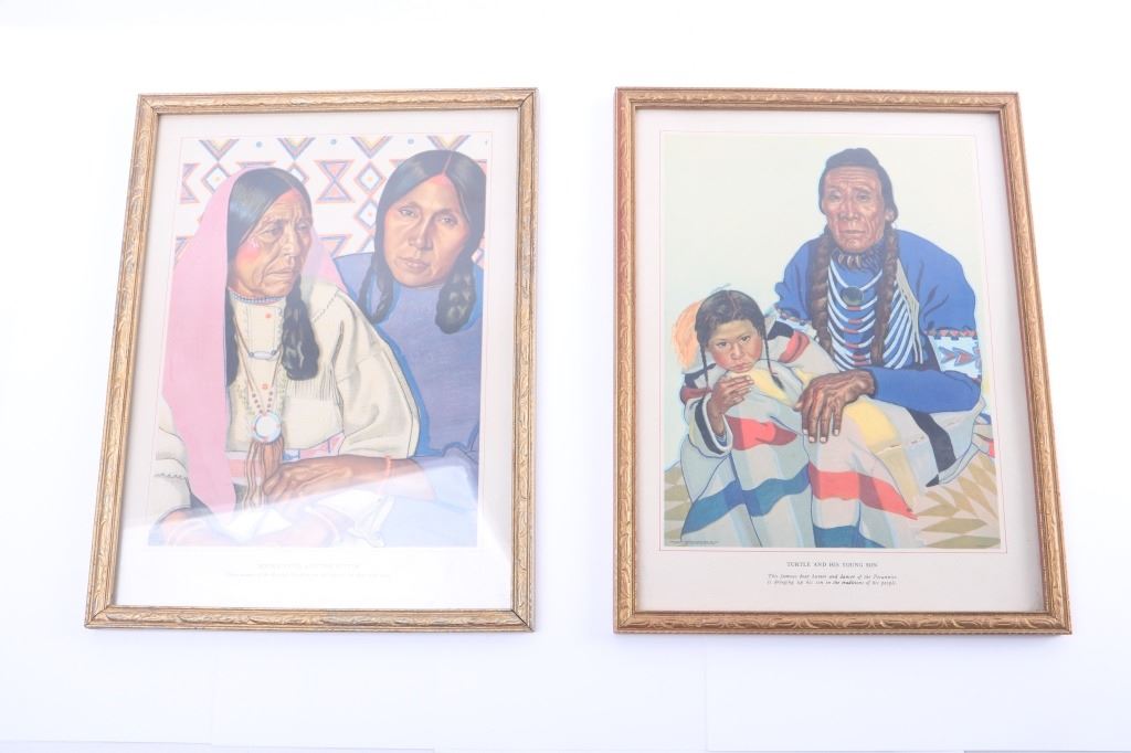 Featured in this lot is this framed lithograph pair from Winold Reiss (born 1886 and died 1953). There are two framed lithographs in this collection, with the first titled "Turtle and His Young Son." The lithograph shows Native American Turtle with his son wrapped in a trade blanket; this famous bear hunter and dancer of the Pecunnies is bringing up his son in the traditions of his people. The second is titled "Double Steel and Two Cutter." The lithograph shows Native Double Steel and Two Cutter cuddled up with a trade blanket back drop; these women of the Kainah Blackfeet are well known for their bead work. The condition of this pair of framed lithographs is good, with no obvious signs of damage. The measurements of this pair of framed artwork are 12 5/8" x 9 5/8" and the visible art measures 11 5/8" x 8 5/8".