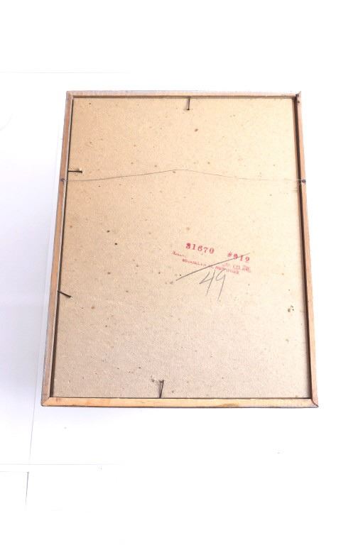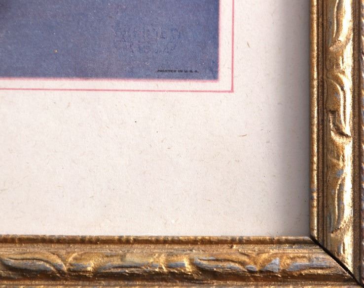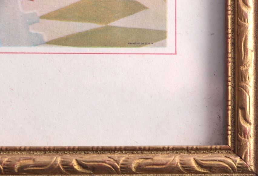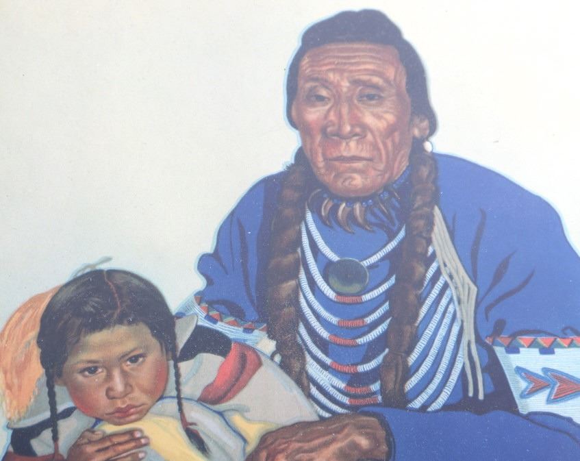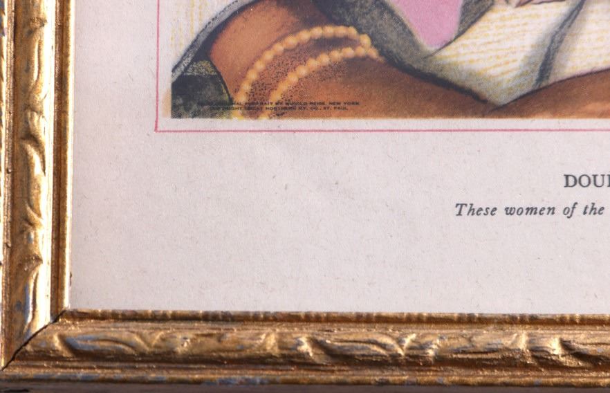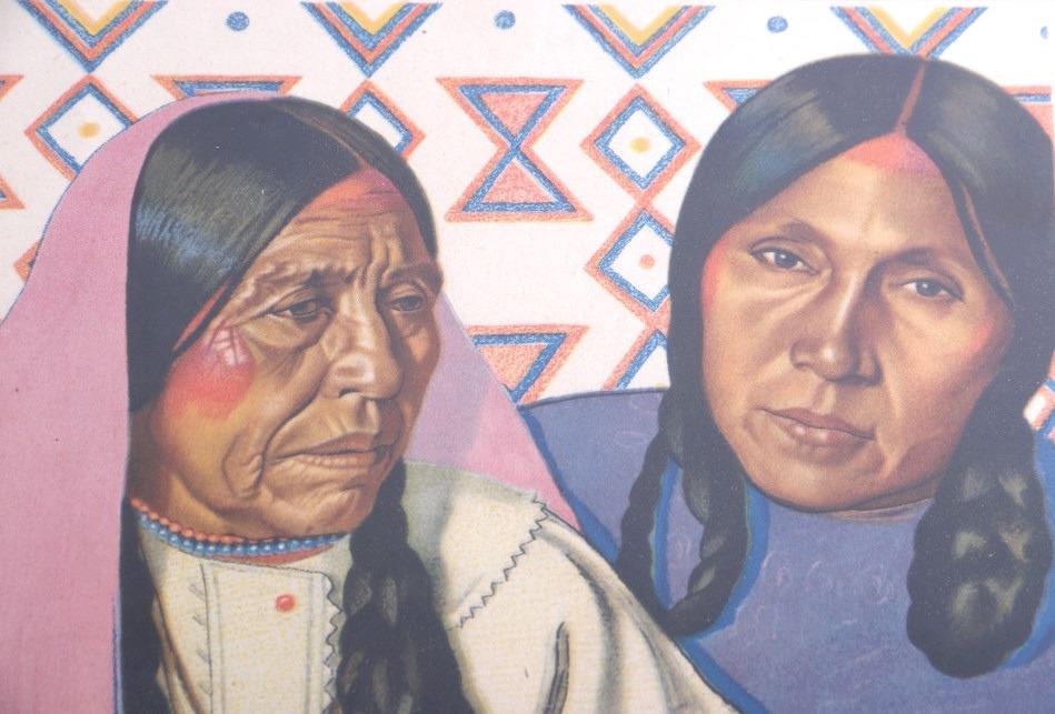 Featured in this lot is this framed lithograph pair from Winold Reiss (born 1886 and died 1953). There are two framed lithographs in this collection, with the first titled "Turtle and His Young Son." The lithograph shows Native American Turtle with his son wrapped in a trade blanket; this famous bear hunter and dancer of the Pecunnies is bringing up his son in the traditions of his people. The second is titled "Double Steel and Two Cutter." The lithograph shows Native Double Steel and Two Cutter cuddled up with a trade blanket back drop; these women of the Kainah Blackfeet are well known for their bead work. The condition of this pair of framed lithographs is good, with no obvious signs of damage. The measurements of this pair of framed artwork are 12 5/8" x 9 5/8" and the visible art measures 11 5/8" x 8 5/8".