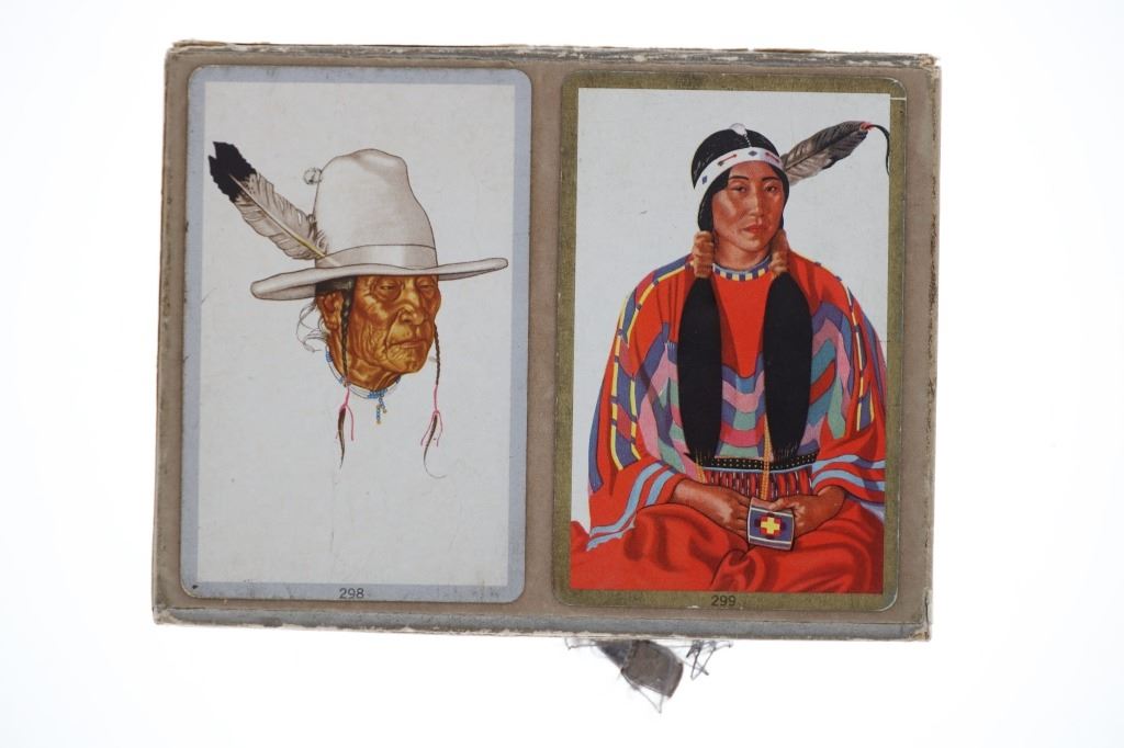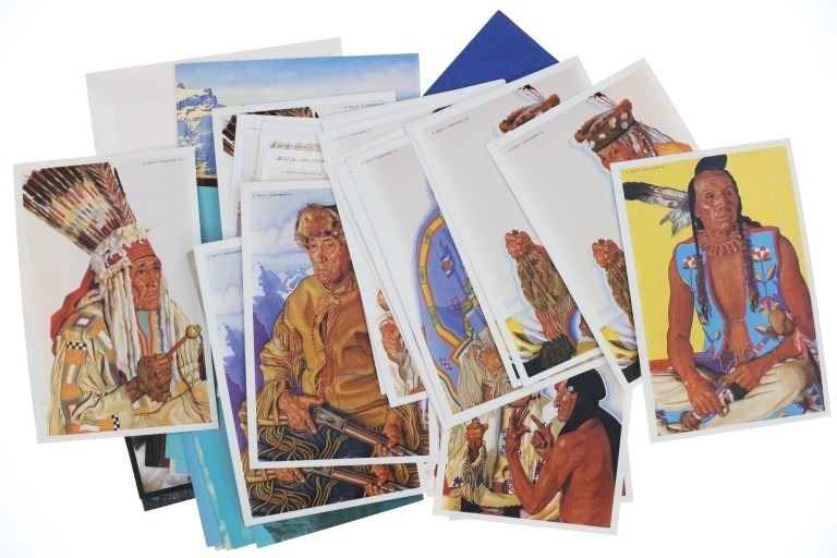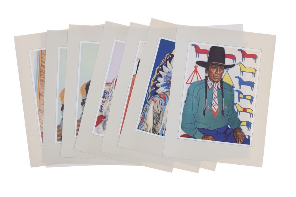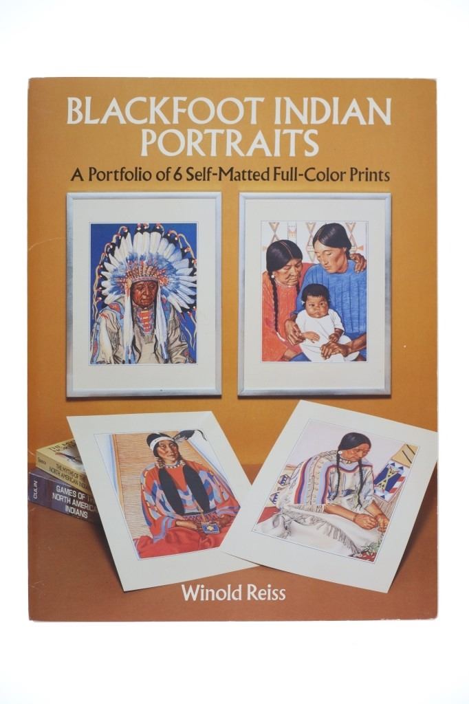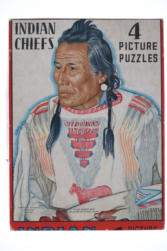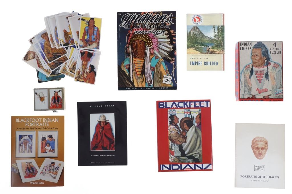 For your consideration is this lot of Winold Reiss "Blackfeet", Great Northern Railway & Glacier National Park ephemera from the 1950s to late 1990s. This lot features four Winold Reiss books, playing cards with Winold Reiss art, Winold Reiss four set puzzle box, Winold Reiss self-matted full color Blackfoot Indian portrait prints, GNRR Empire Builder reproduction menu, Glacier National Park & GNRR postcards and Winold Reiss artwork (18) postcards (29). The books included are as follows: "Winold Reiss - Portraits of the Races" by Paul Raczka, "Winold Reiss - An Illustrated Checklist of His Portraits" by Jeffrey C. Stewart, "Blackfeet Indians, Pictures by Winold Reiss" Story by Frank B. Linderman and "Indians of the Northwest" by Winold Reiss, published by Walter T. Foster. The puzzle box is titled, "Indian Chiefs" and features four picture puzzles. There are some duplicates of the Winold Reiss postcards, but no duplicates in the Glacier National Park or GNRR postcards. The playing cards are in good condition and feature two decks in the box. One deck is missing two cards and the other deck is missing one card. One deck shows a Winold Reiss Blackfeet artwork backing and the other shows duck hunting dogs. The ephemera shows good condition overall with some wear present from its age and use over the years, but no major signs of damage is noted. The pieces measure from 5" L x 3 1/2" W to 13 5/8" L x 10 1/4" W and have a collective weight of 5 pounds and 11 ounces.