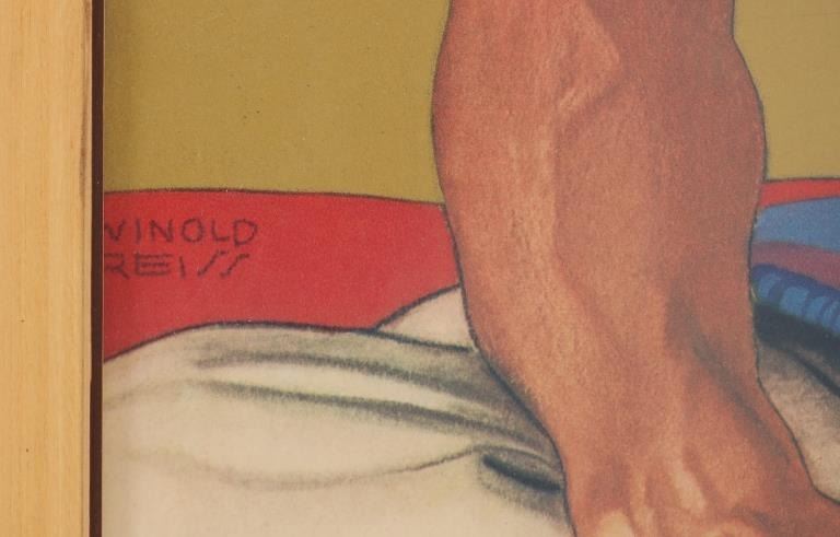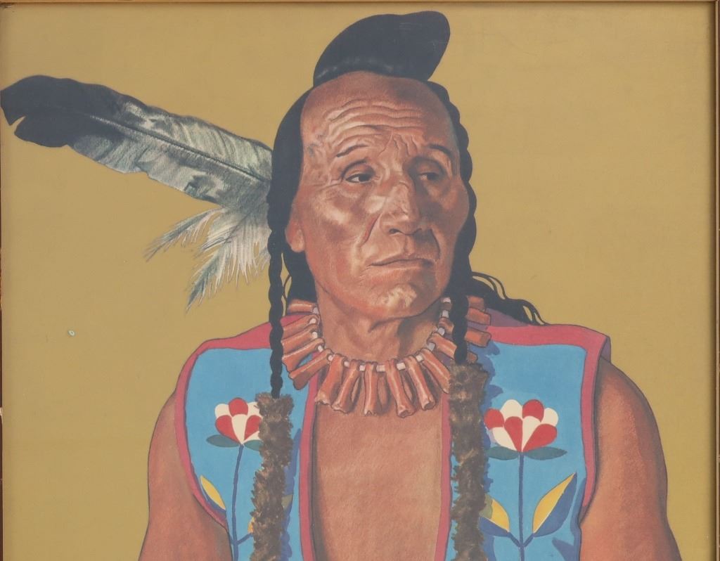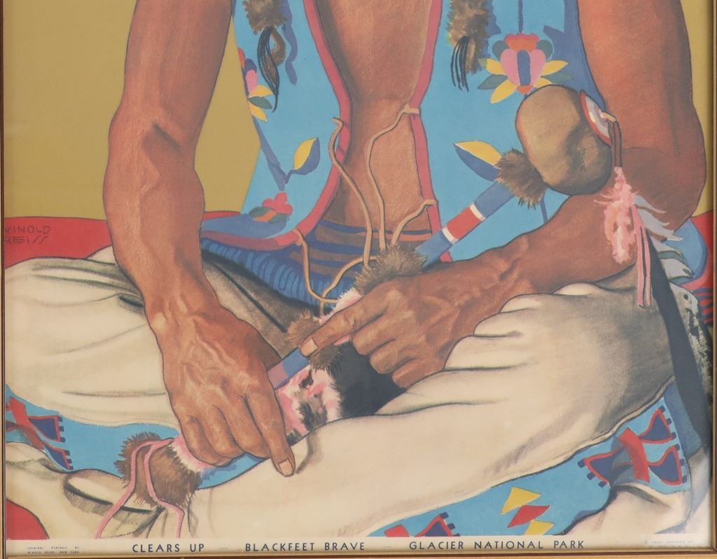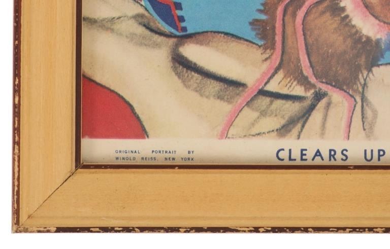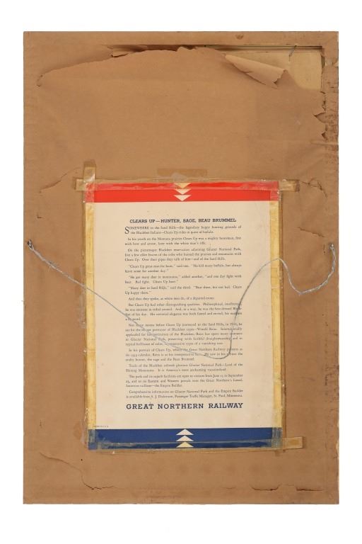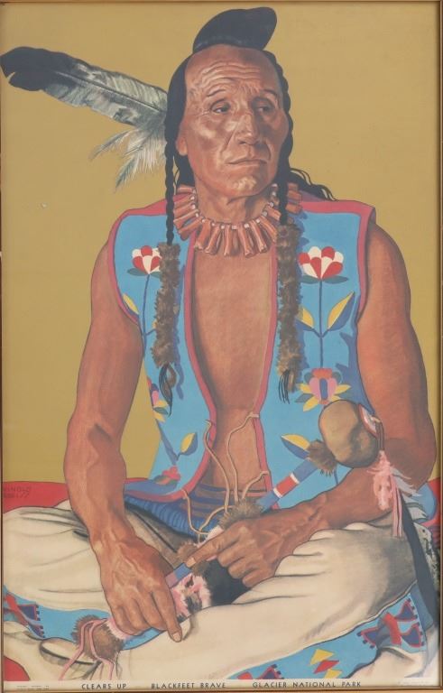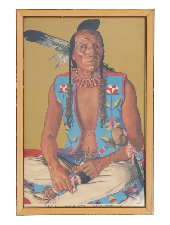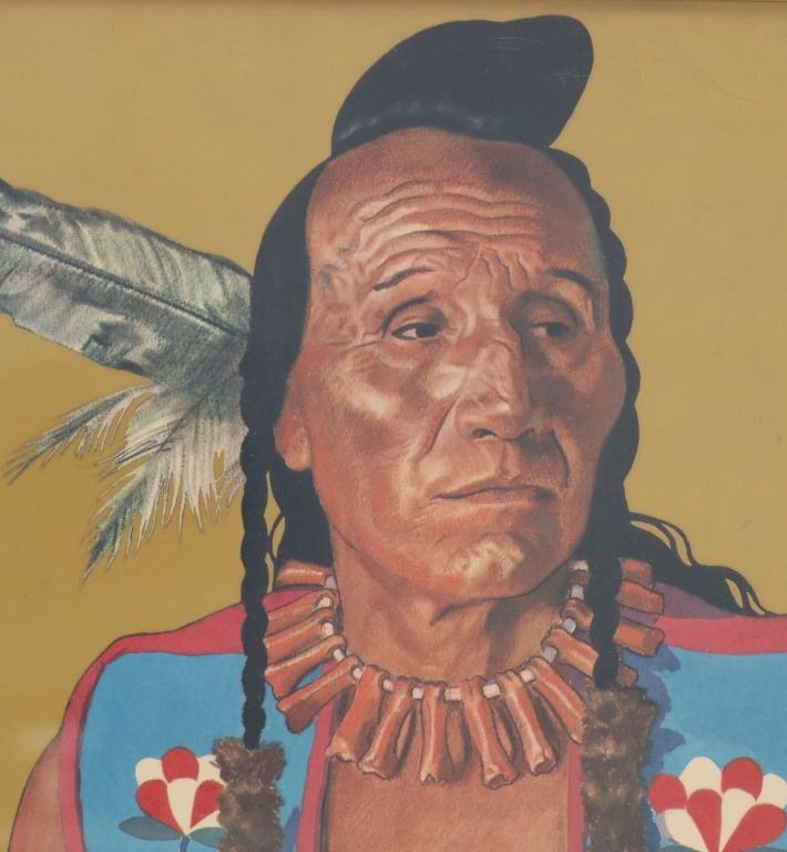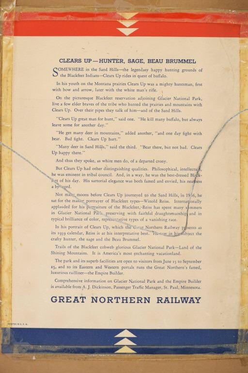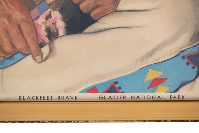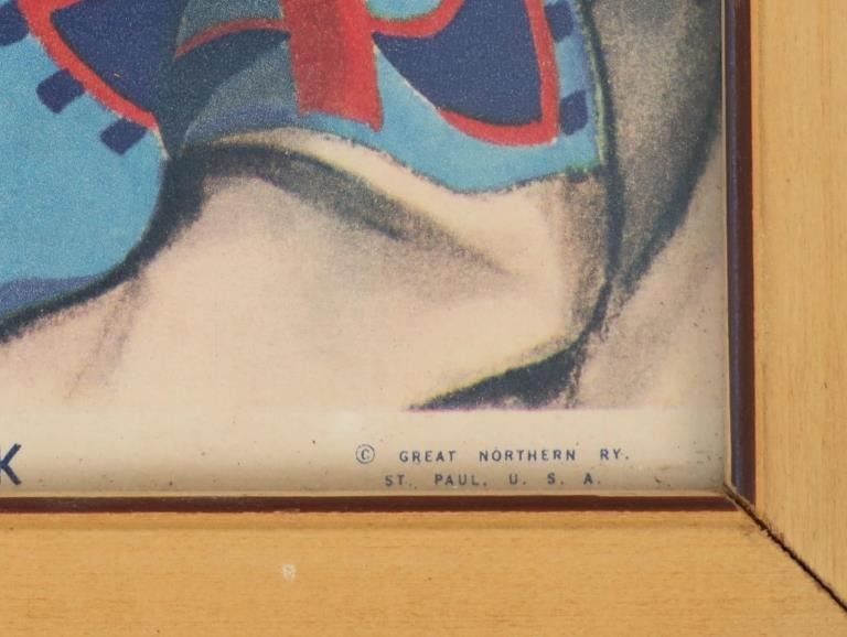 For your consideration is this Winold Reiss Great Northern Railroad framed calendar topper of Blackfeet Tribe member, Clears Up circa 1932. F. Winold Reiss was a German-born American artist and graphic designer. In 1920 he went West for the first time, working for months on the Blackfeet Reservation in Montana, painting 36 portraits of tribal members. Over the years Reiss painted more than 250 works depicting Native Americans. Similar paintings by Reiss became known more widely beginning in the 1920 and to the 1950s, when the Great Northern Railway commissioned Reiss to do paintings of the Blackfeet which were then distributed widely as lithographed reproductions on Great Northern calendars. This shows Clears Up sitting crisscross on the ground wearing a colorful shirt, a bone necklace and a feather in his braided hair. The bottom reads, Original Portrait by Winold Reiss, New York / Clears UP - Blackfeet Brave - Glacier National Park / ©Great Northern RY. St. Paul, U.S.A.". The back of the frame gives an extensive write up on the life and personality of Blackfeet member Clears Up. The piece is set in a light colored wood frame. Both the art and frame show good condition overall with slight wear from its age and use over the years. No signs of obvious damage is noted. The visible art measures 18 1/8" L x 11 9/16" W. The entire piece measures 19 5/8" L x 13 1/8" W x 1" D and weighs 2 pounds.
