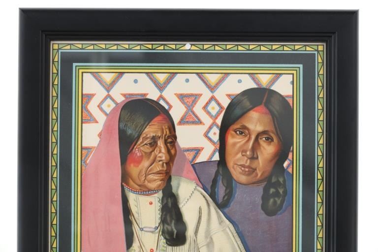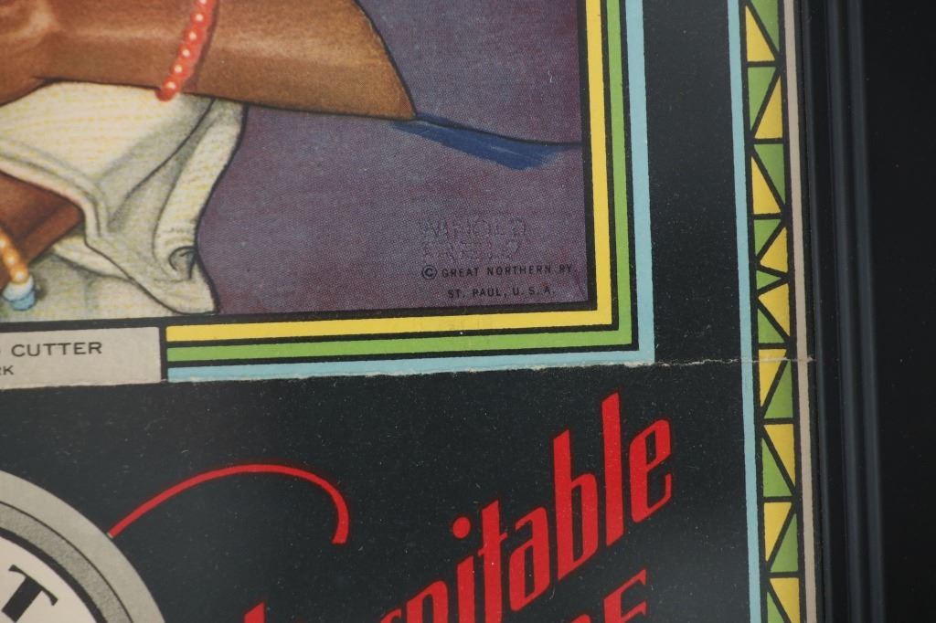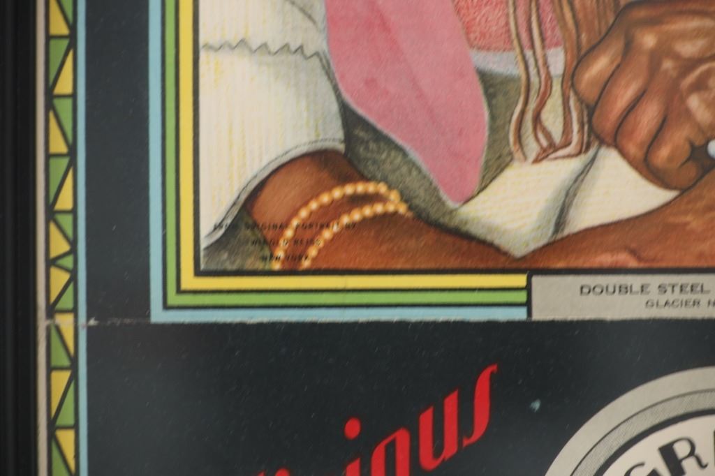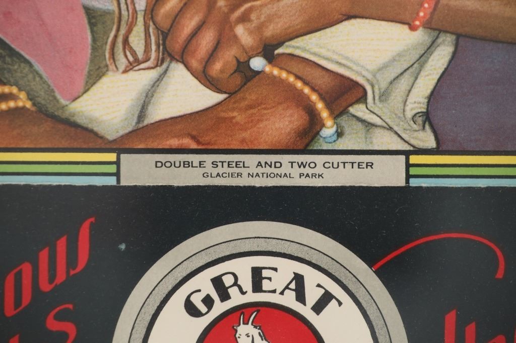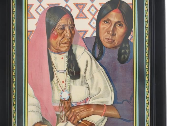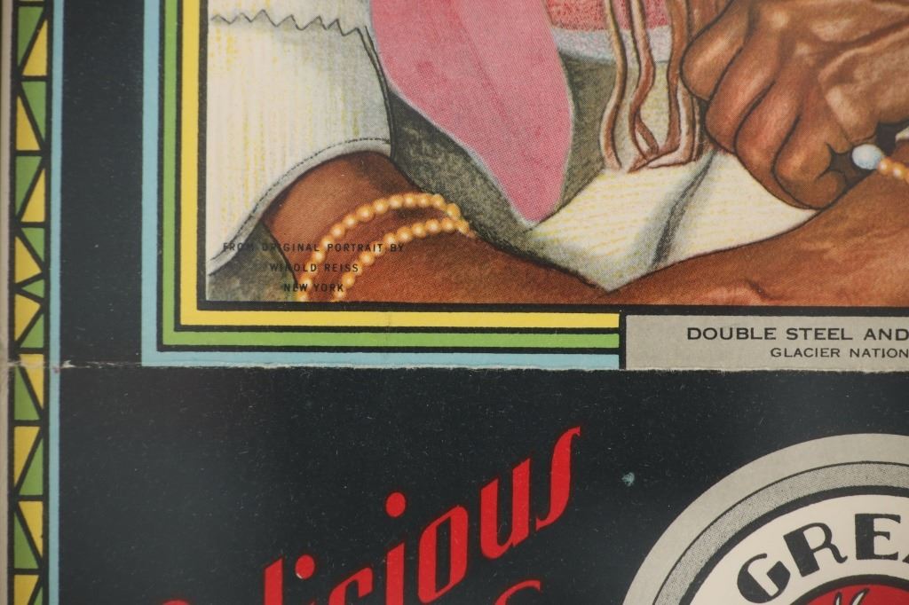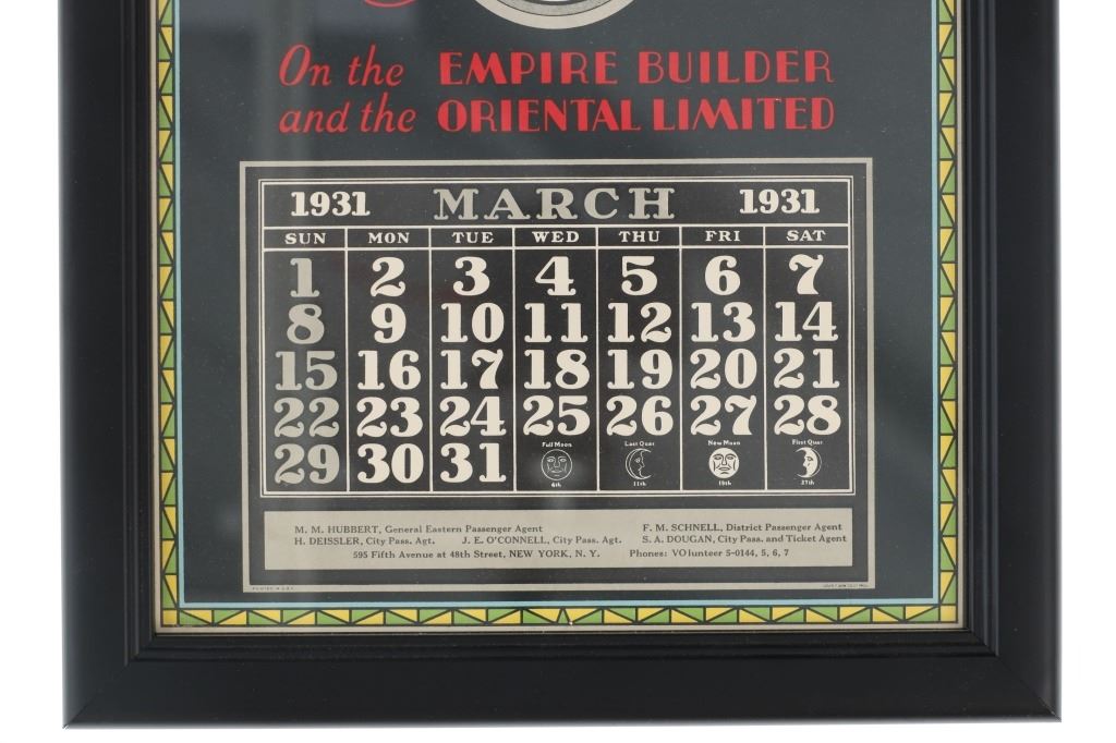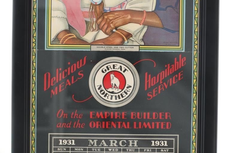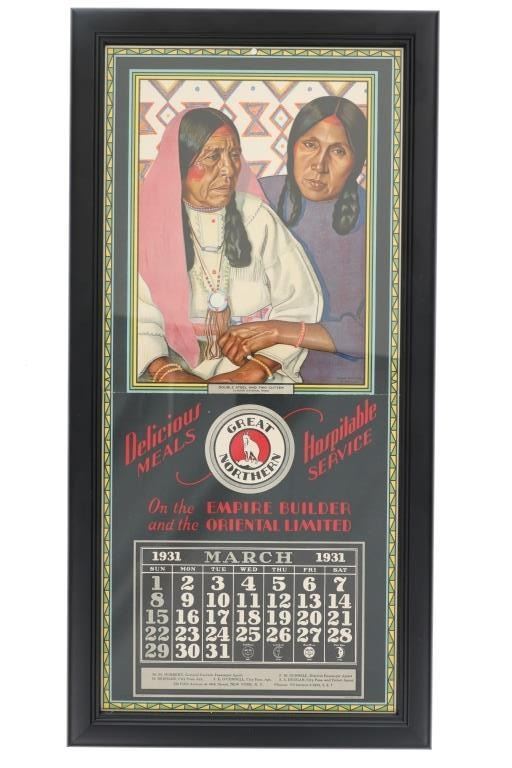 For your consideration is this original, 1931 Winold Reiss calendar from the Great Northern Railway. F. Winold Reiss was a German-born American artist and graphic designer. In 1920, he went West for the first time, working for months on the Blackfeet Reservation in Montana, painting 36 portraits of tribal members. Over the years Reiss painted more than 250 works depicting Native Americans. These paintings by Reiss became known more widely beginning in the 1920s to the 1950s, when the Great Northern Railway commissioned Reiss to do paintings of the Blackfeet which were then distributed widely as lithographed reproductions on Great Northern calendars. In 1931, and 1934-37, Reiss organized a summer art school, also referred to as an artists' colony near Glacier National Park. This calendar features Winold Reiss's painting of "Double Steel & Two Cutter" in Glacier National Park. It is advertising great meals and hospitality on the Empire Builder and Oriental Limited. The calendar only features the month of March, 1931. It is set in a black frame and sits behind glass to preserve its condition. Slight wear present with a crease in the middle from original shipping, but no major signs of damage noted. The visible calendar measures 21 7/8" L x 9 3/4" W, while the entire piece measures 24 1/8" L x 12" W x 1 1/4" D. It weighs 2 pounds and 14 ounces.