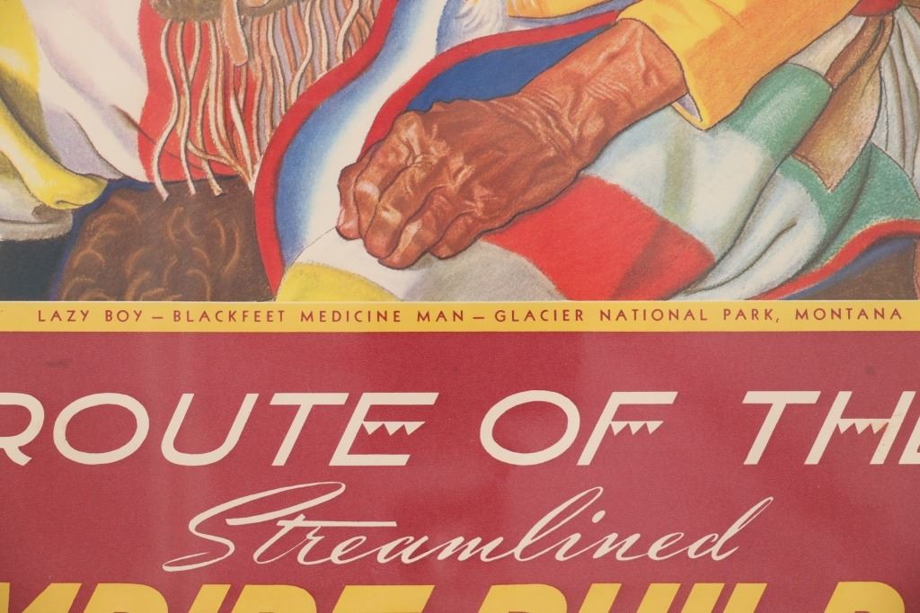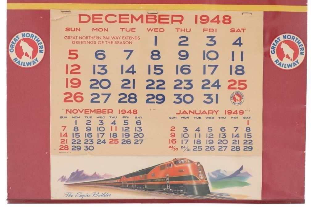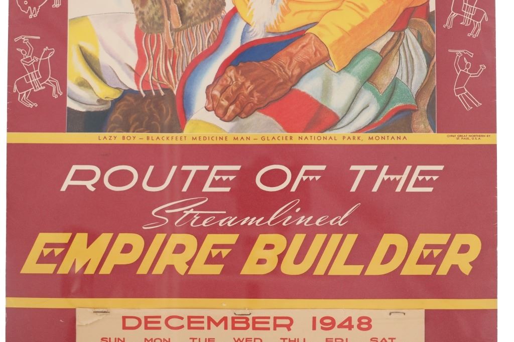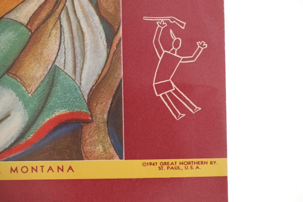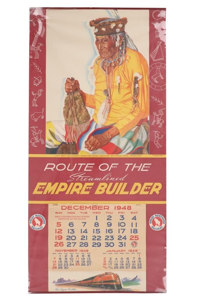 Featured in this lot is this original, 1947 Winold Reiss calendar from the Great Northern Railway. F. Winold Reiss was a German-born American artist and graphic designer. In 1920, he went West for the first time, working for months on the Blackfeet Reservation in Montana, painting 36 portraits of tribal members. Over the years Reiss painted more than 250 works depicting Native Americans. These paintings by Reiss became known more widely beginning in the 1920s to the 1950s, when the Great Northern Railway commissioned Reiss to do paintings of the Blackfeet which were then distributed widely as lithographed reproductions on Great Northern calendars. In 1931, and 1934-37, Reiss organized a summer art school, also referred to as an artists' colony near Glacier National Park. This calendar features Winold Reiss's painting of "Lazy Boy", a Blackfeet medicine man in Glacier National Park. The calendar has been used and only features the month of December, 1948. The calendar shows good condition overall with slight wear present from its age and use over the years, but no major signs of damage is noted. It measures 33 1/4" L x 16" W and weighs 12 ounces.