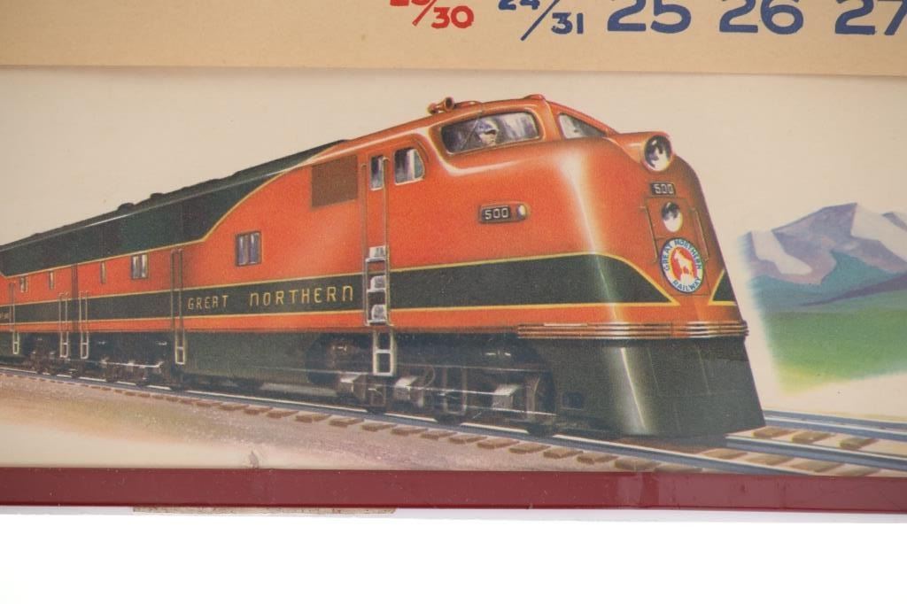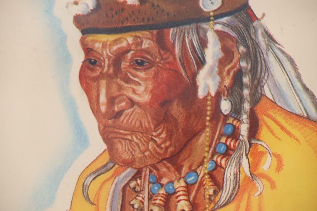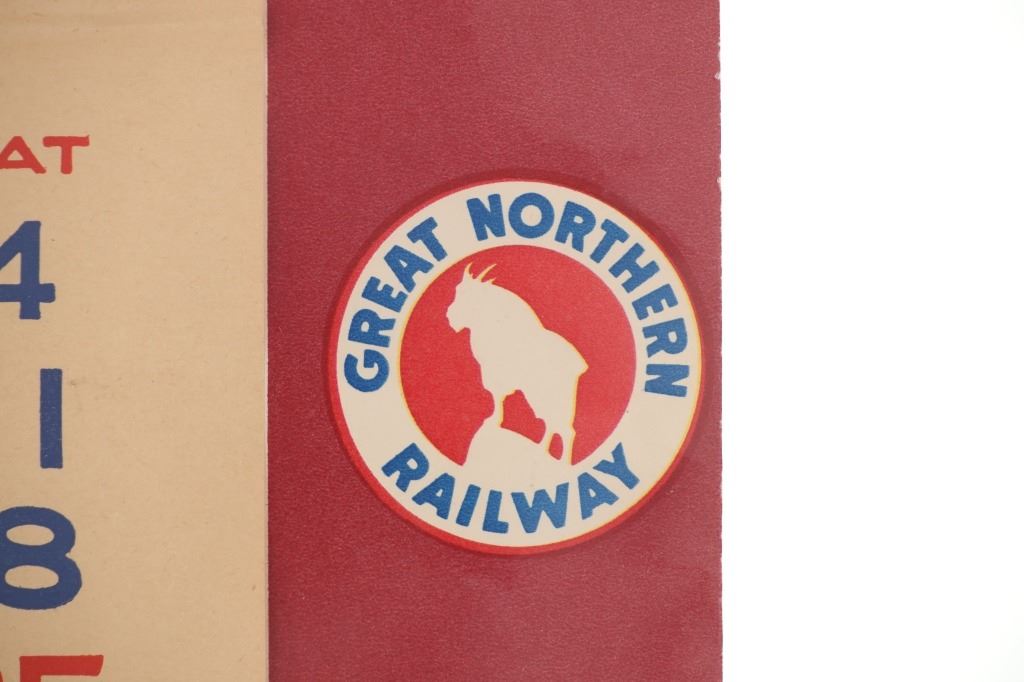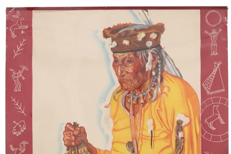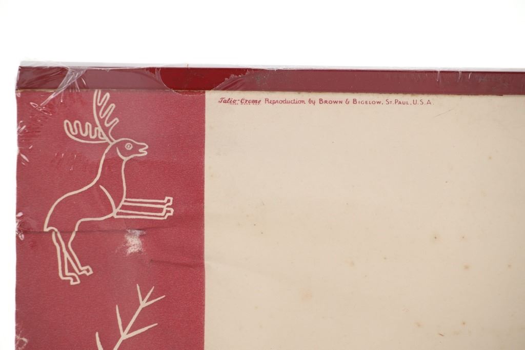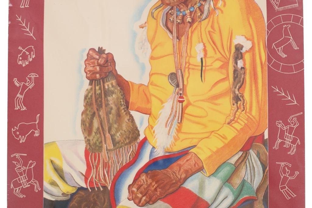 Featured in this lot is this original, 1947 Winold Reiss calendar from the Great Northern Railway. F. Winold Reiss was a German-born American artist and graphic designer. In 1920, he went West for the first time, working for months on the Blackfeet Reservation in Montana, painting 36 portraits of tribal members. Over the years Reiss painted more than 250 works depicting Native Americans. These paintings by Reiss became known more widely beginning in the 1920s to the 1950s, when the Great Northern Railway commissioned Reiss to do paintings of the Blackfeet which were then distributed widely as lithographed reproductions on Great Northern calendars. In 1931, and 1934-37, Reiss organized a summer art school, also referred to as an artists' colony near Glacier National Park. This calendar features Winold Reiss's painting of "Lazy Boy", a Blackfeet medicine man in Glacier National Park. The calendar has been used and only features the month of December, 1948. The calendar shows good condition overall with slight wear present from its age and use over the years, but no major signs of damage is noted. It measures 33 1/4" L x 16" W and weighs 12 ounces.