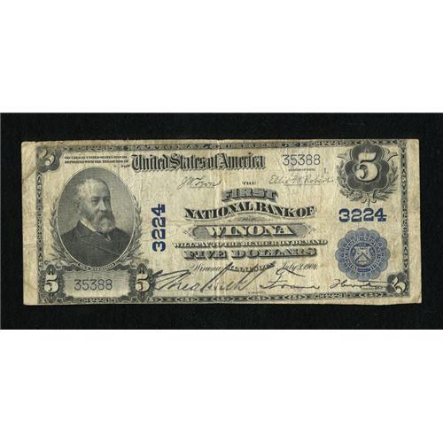 <B>Winona, MN</B></I> - $5 1902 Plain Back Fr. 598 <B>The NB of Winona</B></I> Ch. # 3224<BR>A couple of pinholes are noted on this otherwise fully Fine issue. <B>Very Good-Fine.</B></I><BR><BR><b>Shipping:</b> Coins & Currency (<a target="_blank" href="http://www.heritageauctions.com/common/shipping.php">view shipping information</a>)